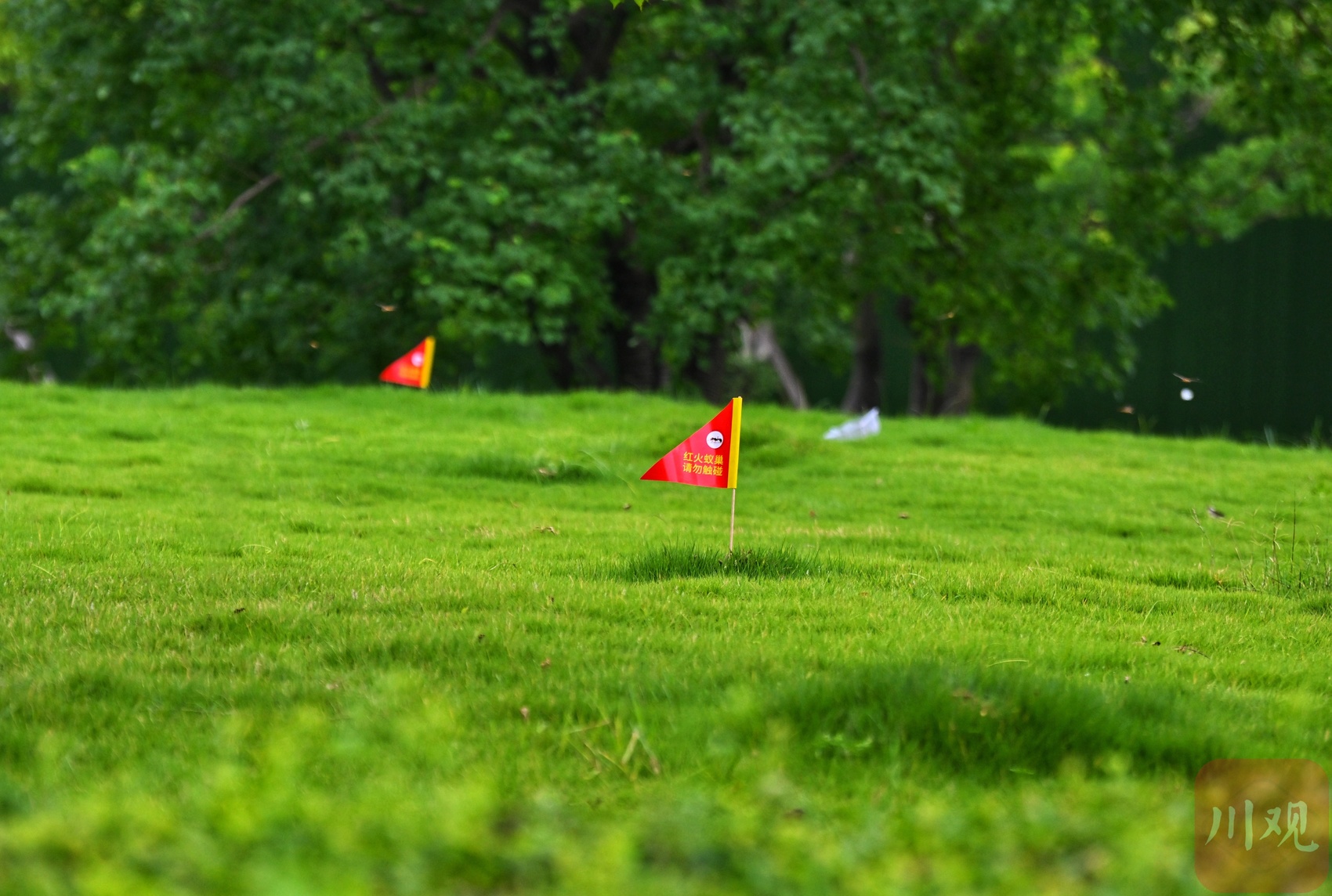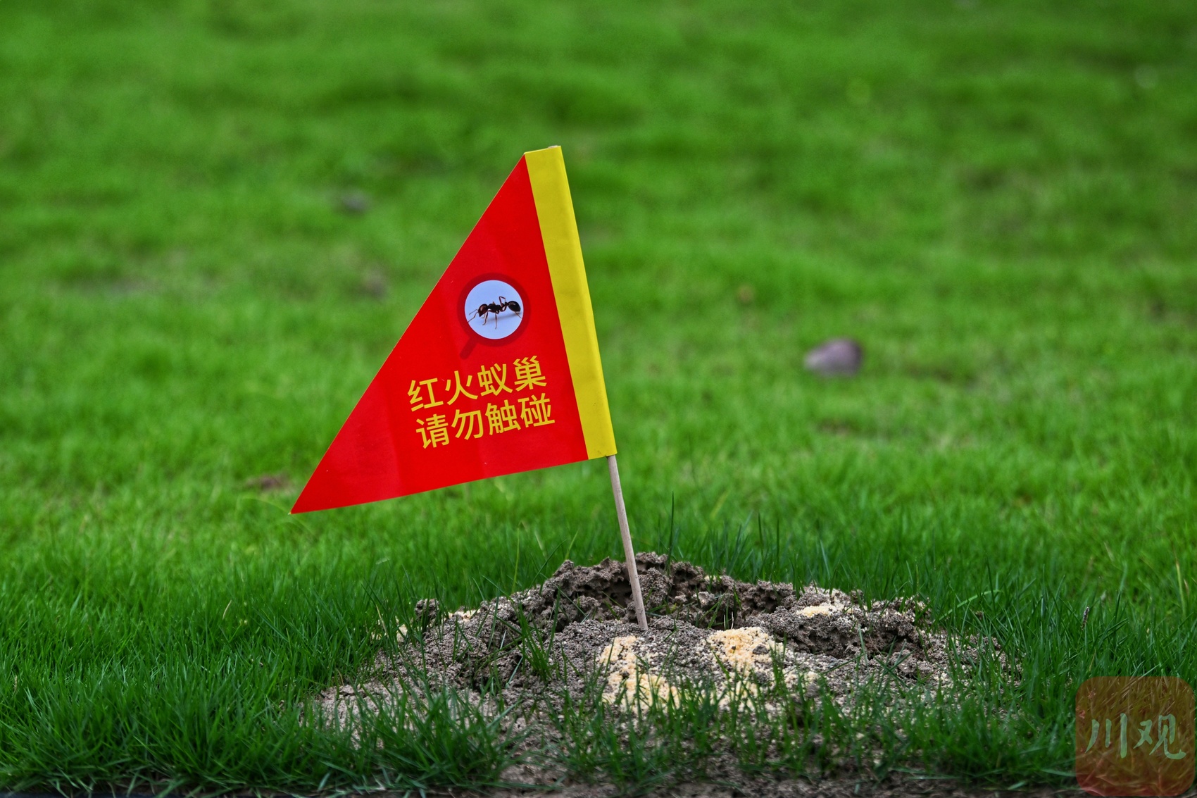 7月2日,成都高新区新程大道新裕南三路临街的草坪上,7、8面小红旗零散插于草坪中褐色隆起的小土堆上,红底黄字的“红火蚁巢 请勿触碰”特别醒目。在相邻还有3处草坪,都用警戒线划出了红火蚁防治区域。这是成都市林业和草原有害生物防治检疫站工作人员在寻到红火蚁踪迹后进行的及时处置。