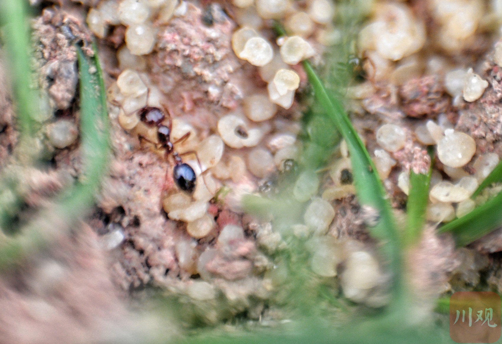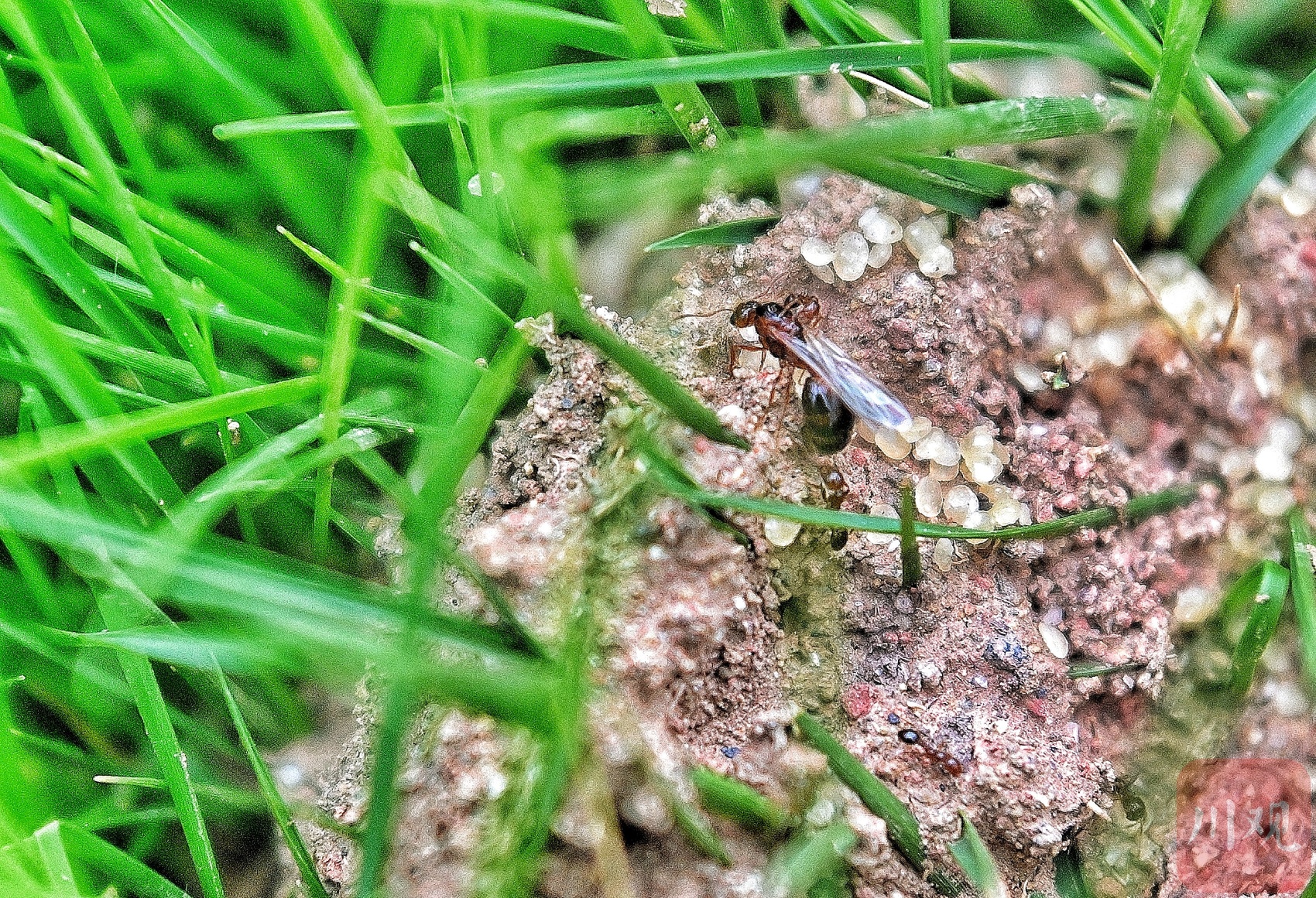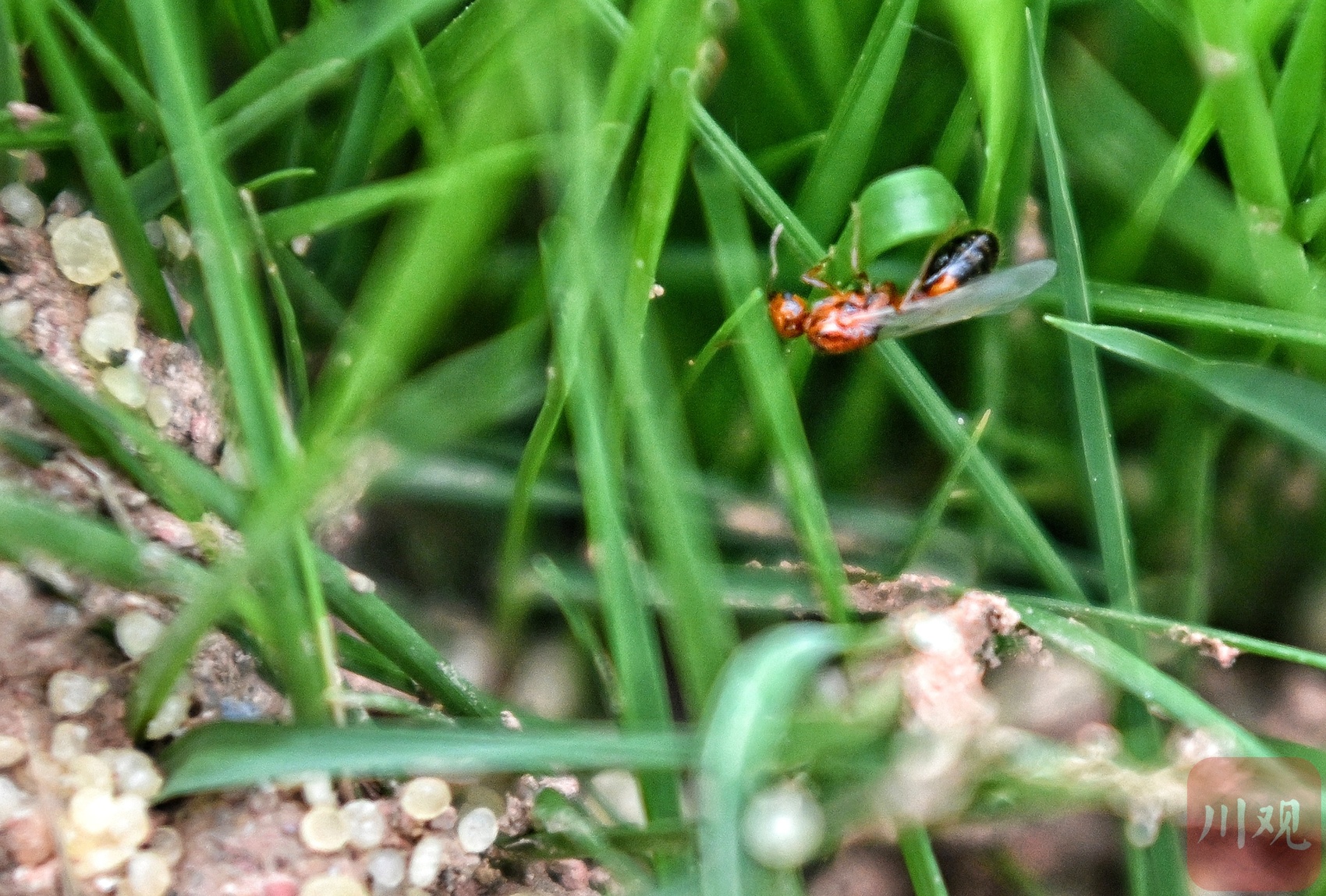 带翅膀的红火蚁是繁育后代的生殖蚁,旁边淡白色的就是红火蚁产的卵。