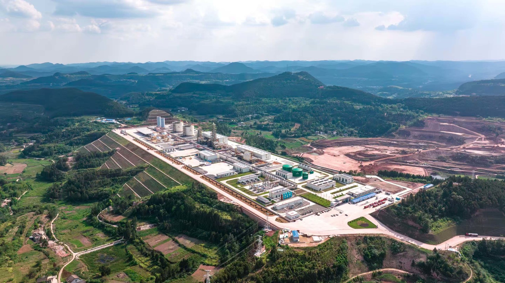 在绵阳市盐亭县,丘陵起伏中,占地36.8万平方米、相当于876个标准篮球场的天然气净化厂“躺卧”山间,从空中看就像一艘航母。