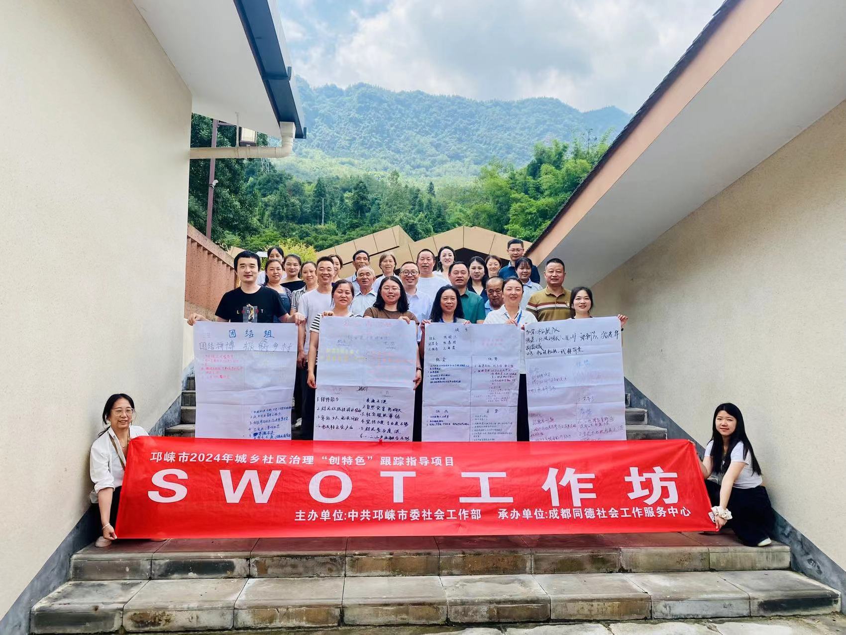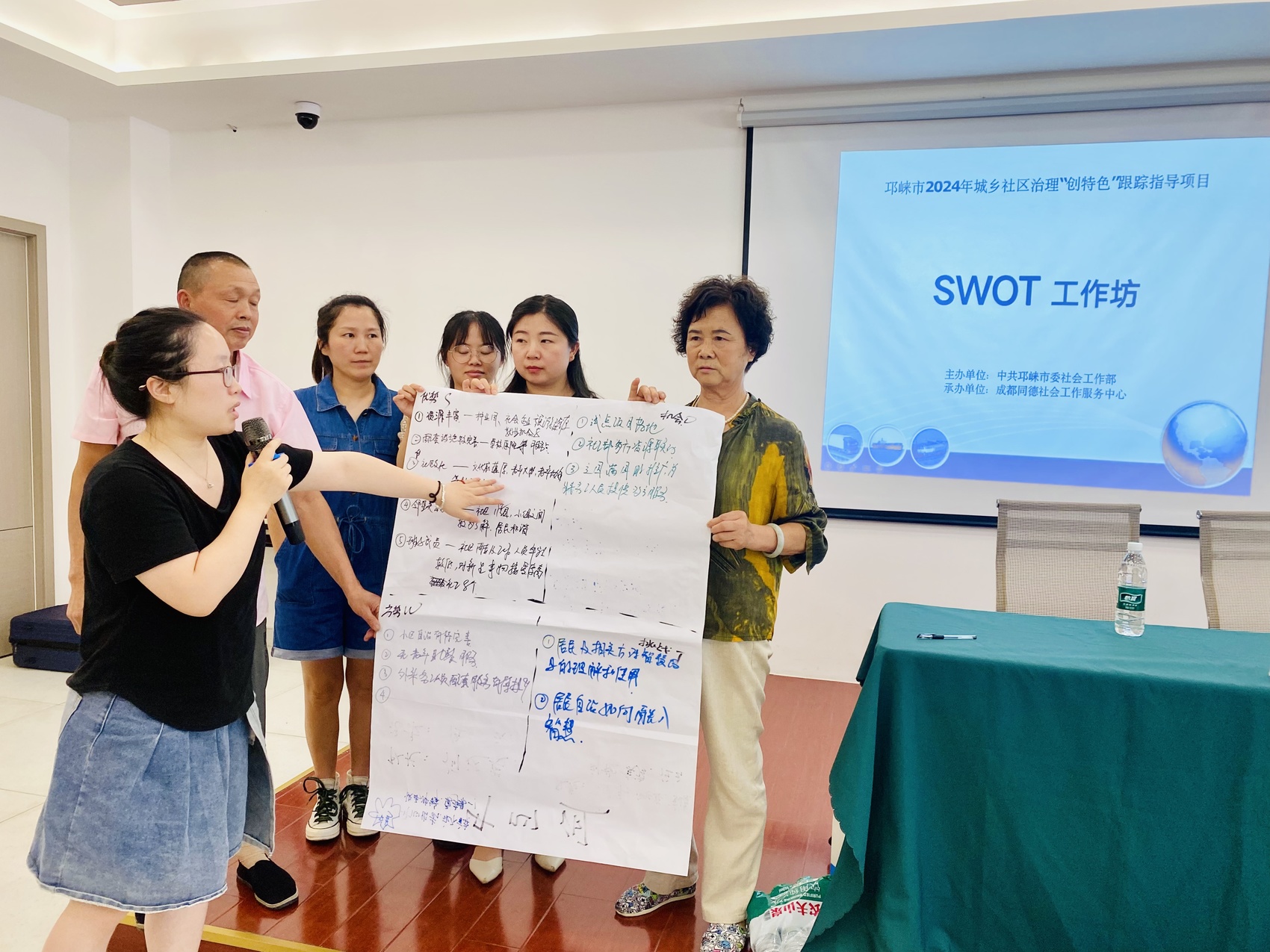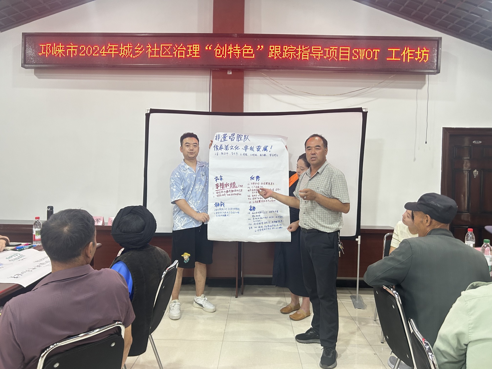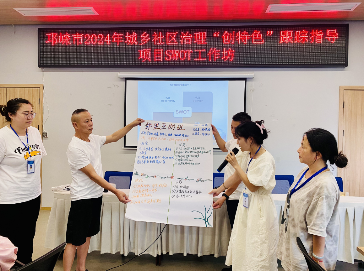 为扎实推进2024年城乡社区治理“创特色”工作,切实提升社区治理成效,6月30日至7月1日,邛崃市组织开展了城乡社区治理“创特色”SWOT工作坊。主题社区“两委”成员、社会组织负责人、社区社会组织骨干、居民骨干、商家、新就业群体及专业社工共同参与。