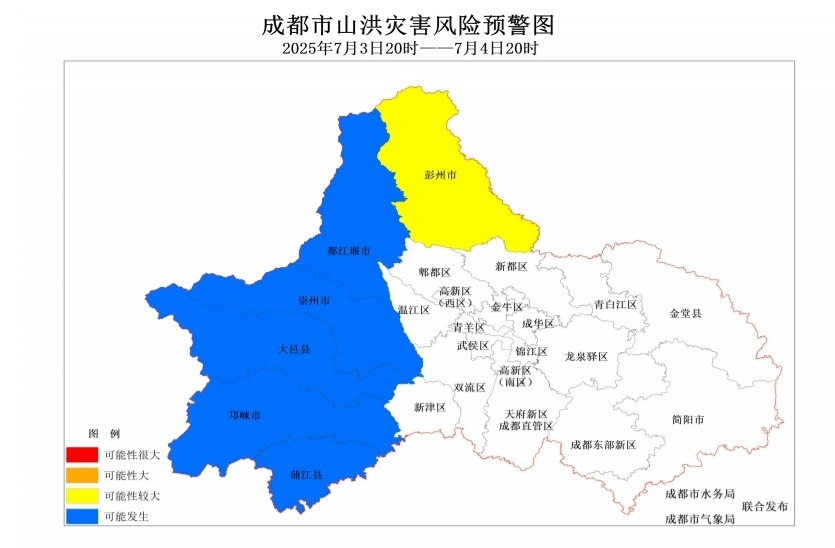 7月3日16时,成都市水务局、成都市气象局共同发布2025年第7期山洪灾害气象预警:7月3日20时至4日20时,彭州市发生山洪灾害可能性较大,等级为黄色;都江堰市、崇州市、大邑县、邛崃市、蒲江县可能发生山洪灾害,等级为蓝色。