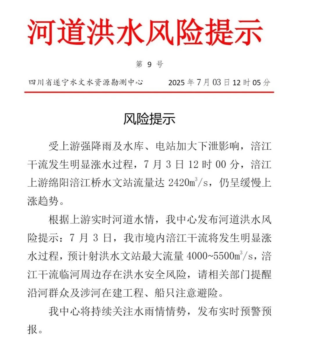 根据上游实时河道水情,7月3日,四川省遂宁水文水资源勘测中心发布河道洪水风险提示:当日,遂宁境内涪江干流将发生明显涨水过程,预计射洪水文站最大流量 4000—5500立方米每秒,涪江干流临河周边存在洪水安全风险,请相关部门提醒沿河群众及涉河在建工程、船只注意避险。