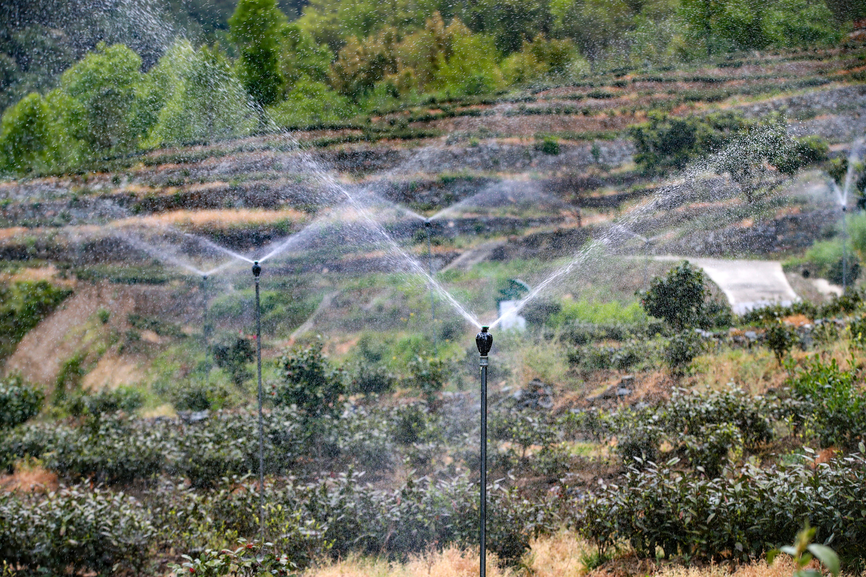 打开喷灌系统,细密的水雾很快弥散在茶园中,迅速带来丝丝凉意。
