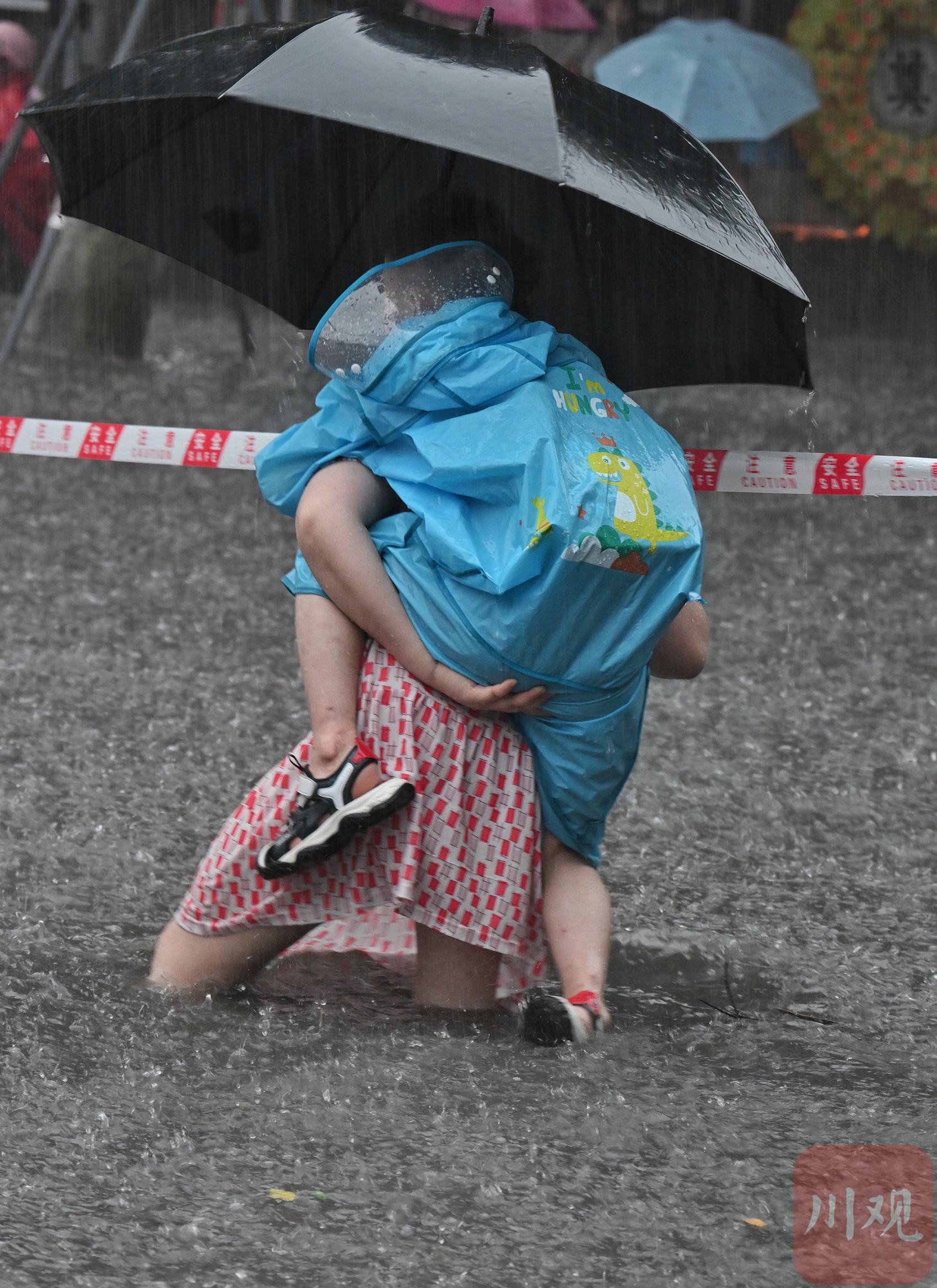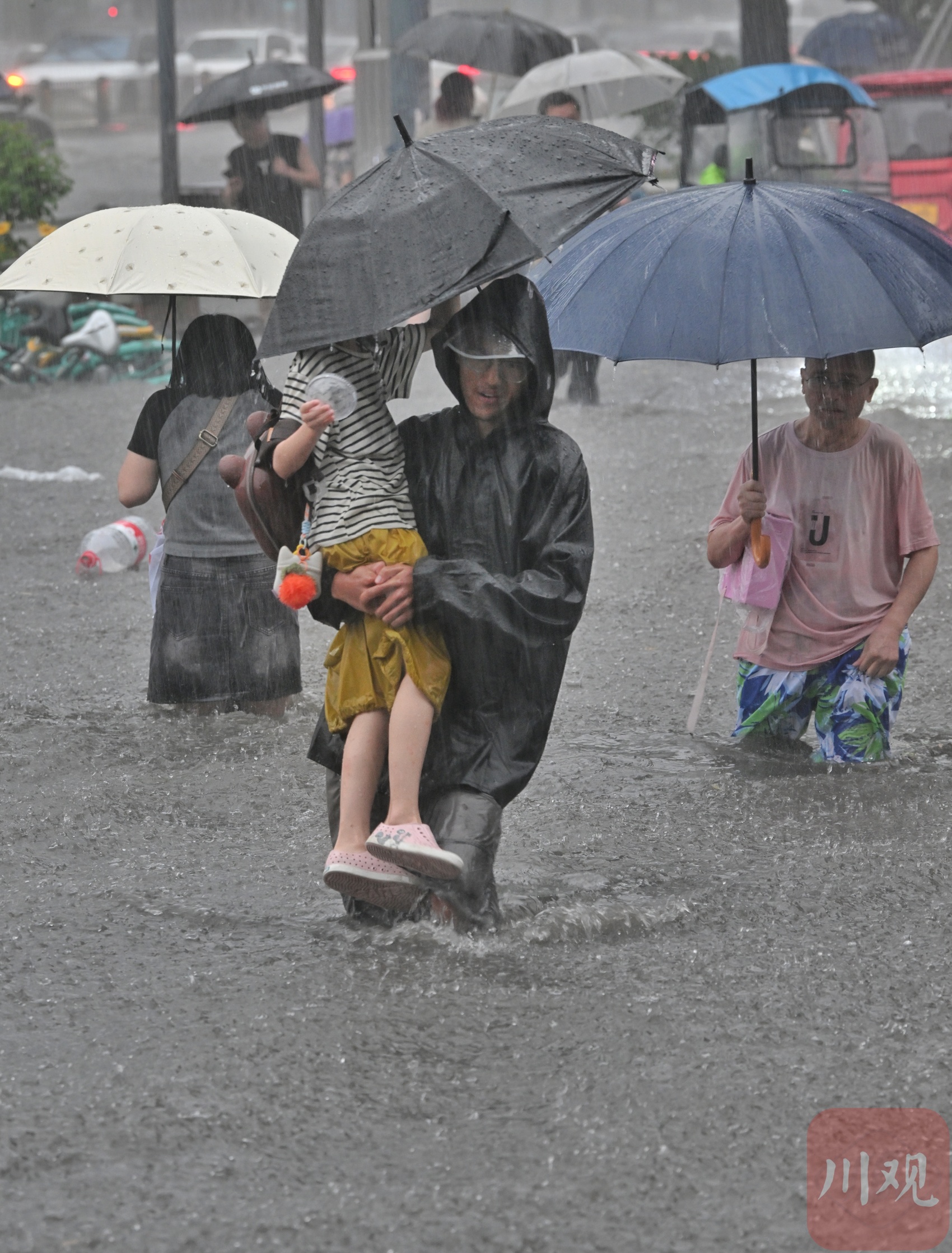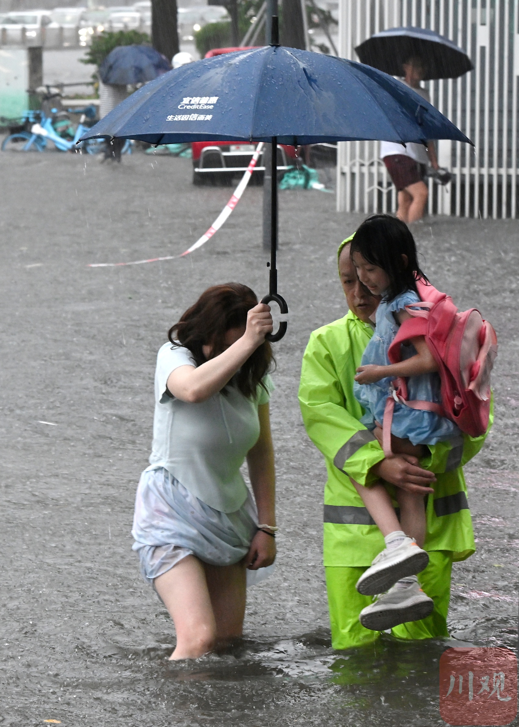 在水碾河南路口,安全员帮助市民涉水通过被淹路口。