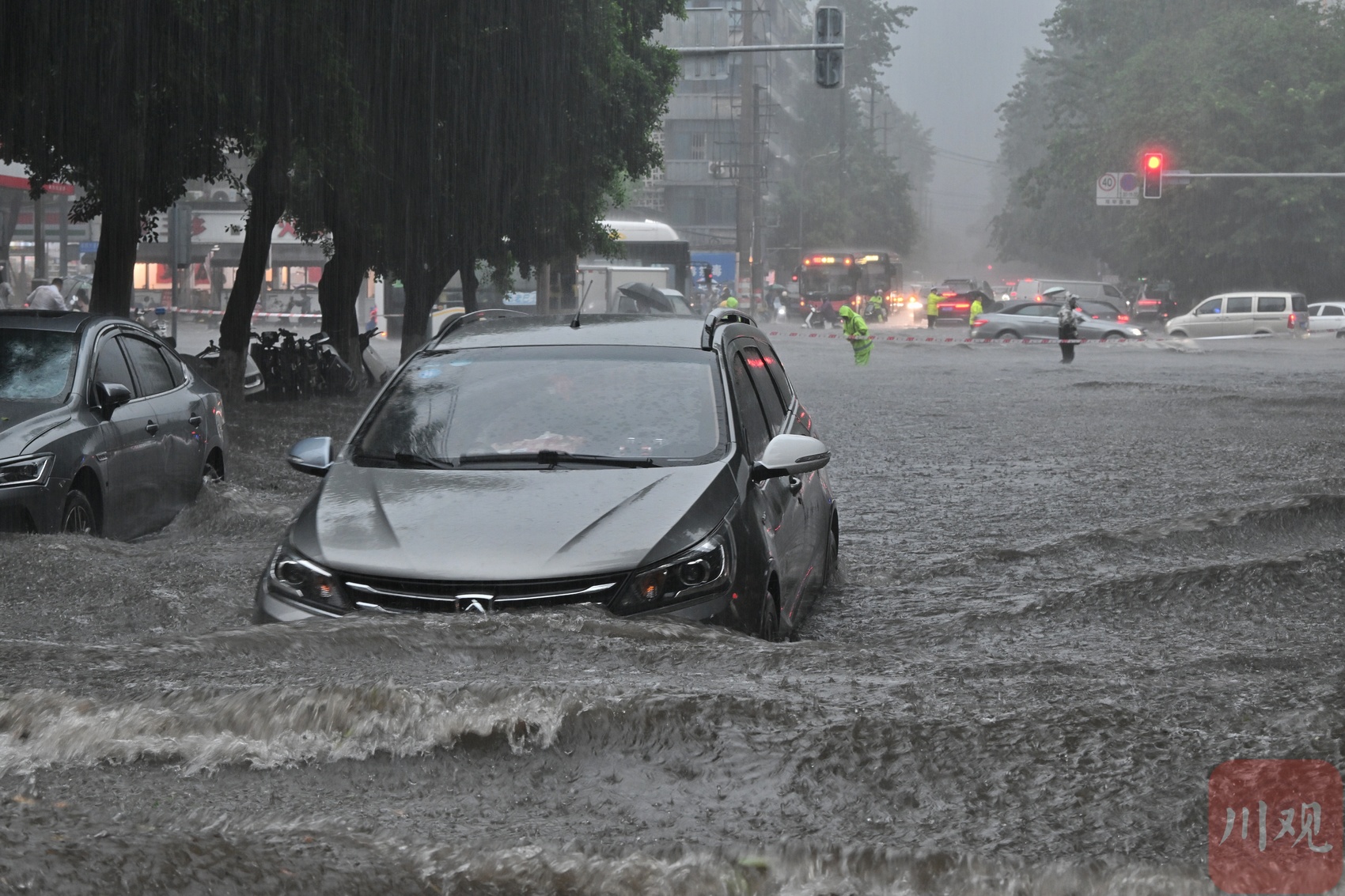 从蜀都大道水碾河分流的车辆涉水通过水碾河南路。