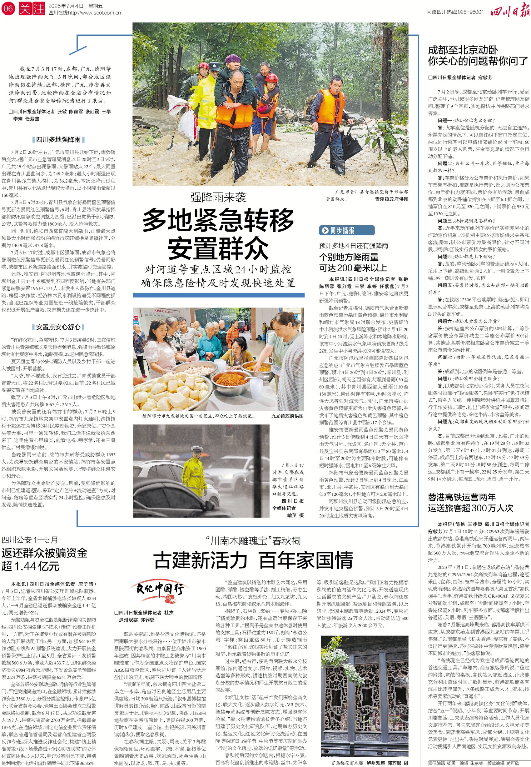 昨日,省内等多地出现强降雨天气,成都更是发布了暴雨红色预警,市区多条道路路面积水。虽然今日凌晨,部分地区降雨已有减弱趋势,但此轮降雨天气仍未结束。此轮降雨在全省分布情况如何?群众是否安全转移?未来24小时天气情况如何?关注六版,看今日这些地方预计还有强降雨。
