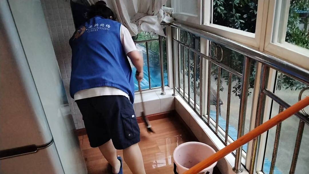 姐儿堰社区鑫阳花园高龄老人家中积水,网格员协助清理