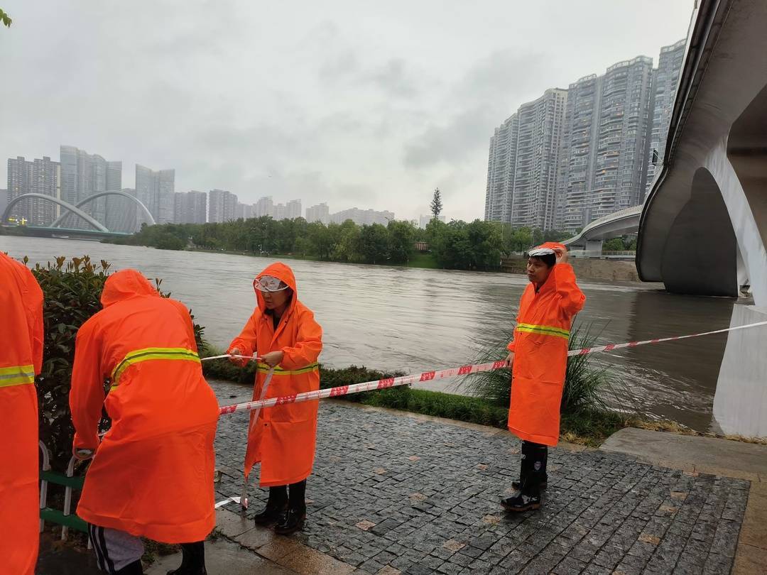 警戒屏障迅速拉起:府河社区、迎江社区针对府河锦江段水位急剧上涨,第一时间在危险区域布置警戒线,并安排专人值守巡查,劝阻居民靠近涉水地带。