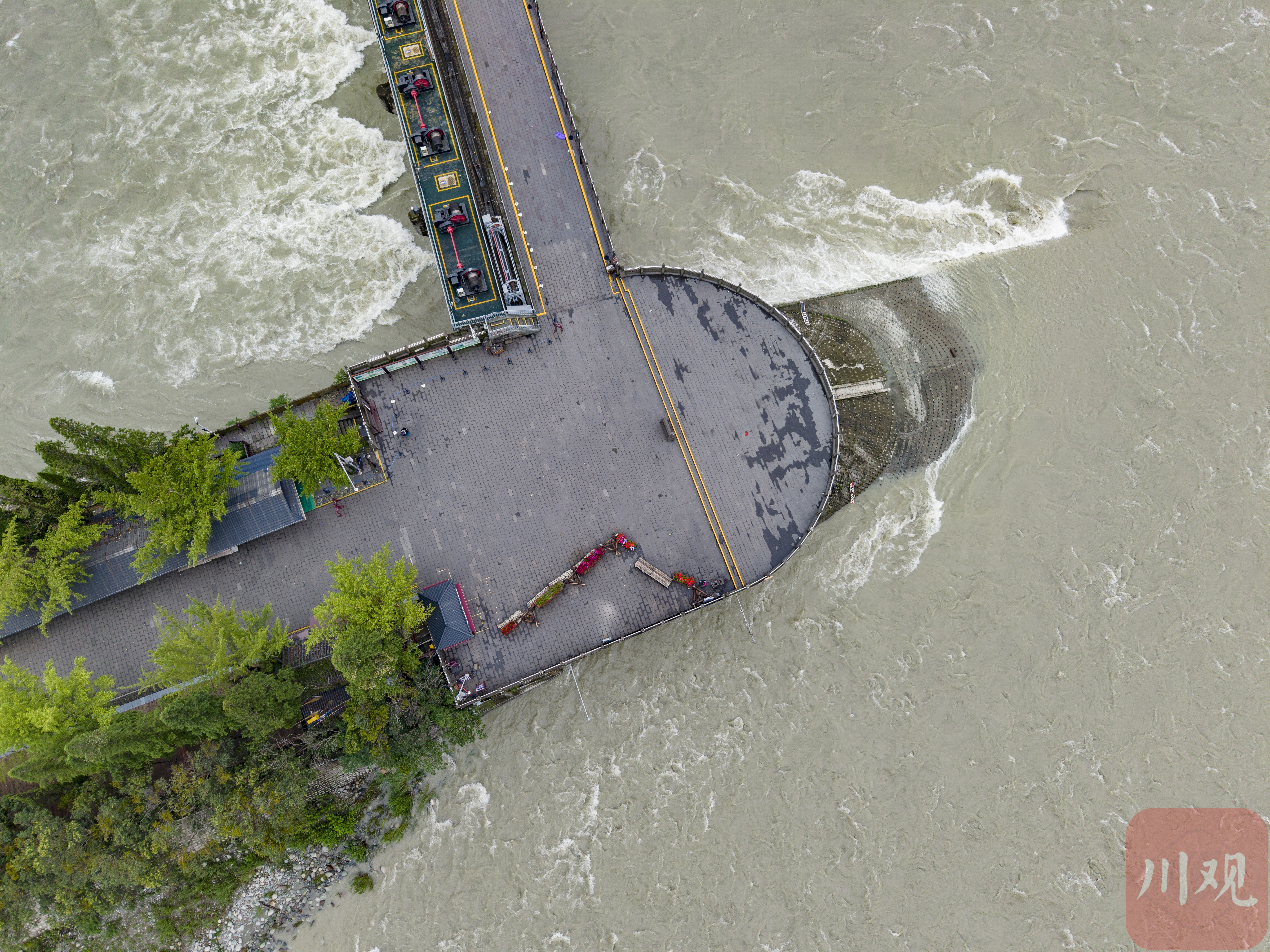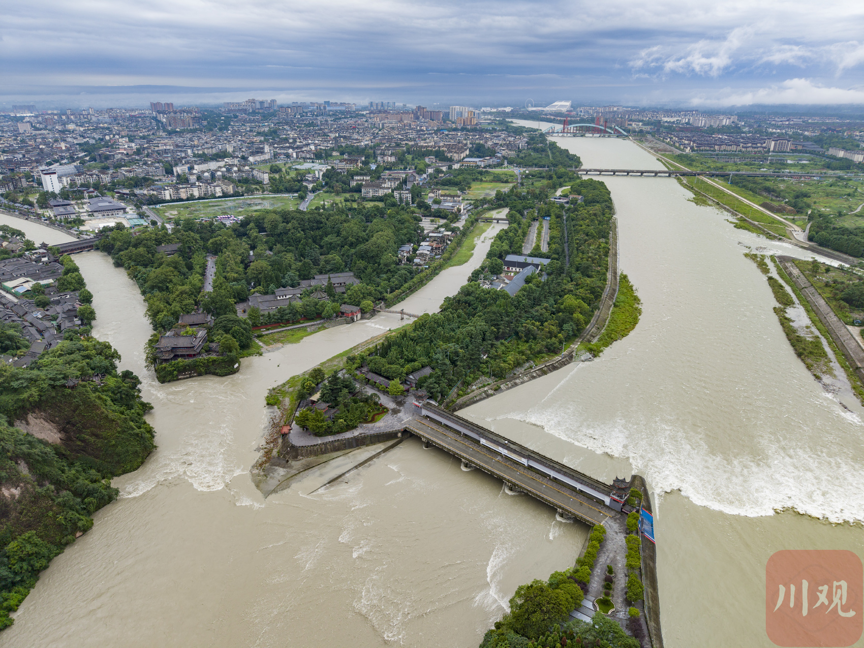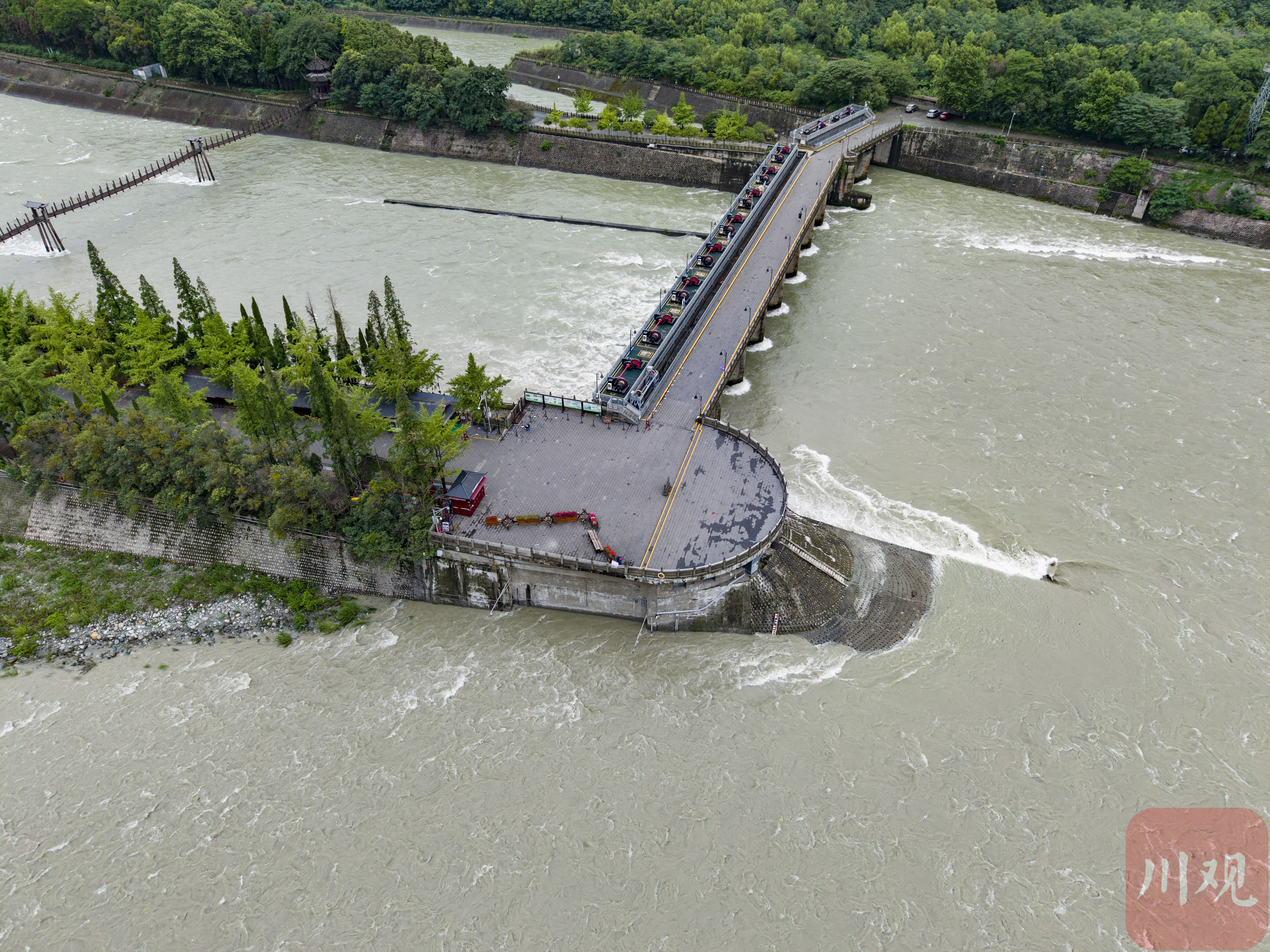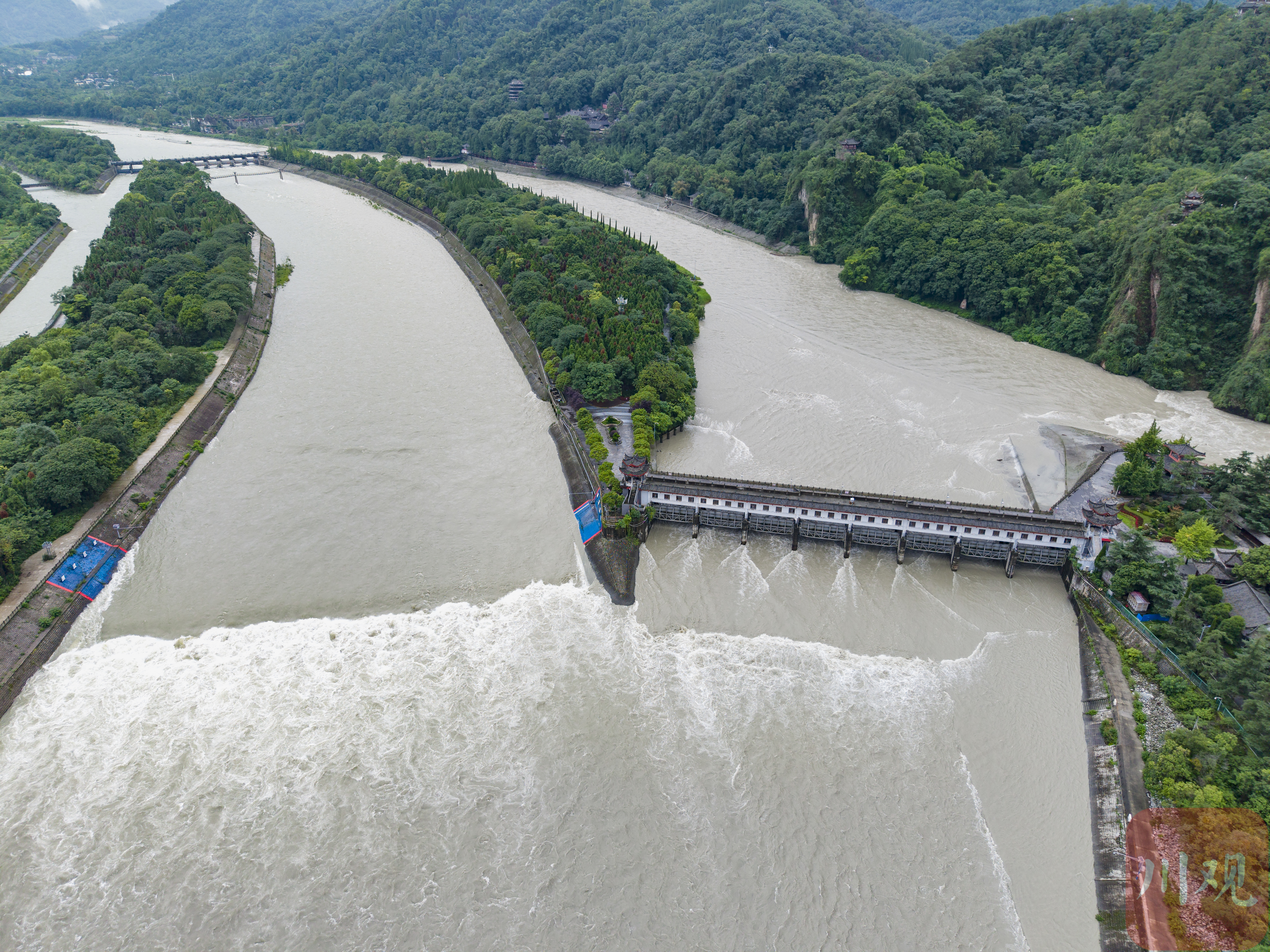 2025年7月4日,都江堰迎来洪峰,岷江水位涨势明显,千年水利工程再现四六分水、自然分流奇观。鱼嘴四六分水,外江闸门、飞沙堰闸门全开,将大部分洪水分流到外江,确保成都平原的安全。