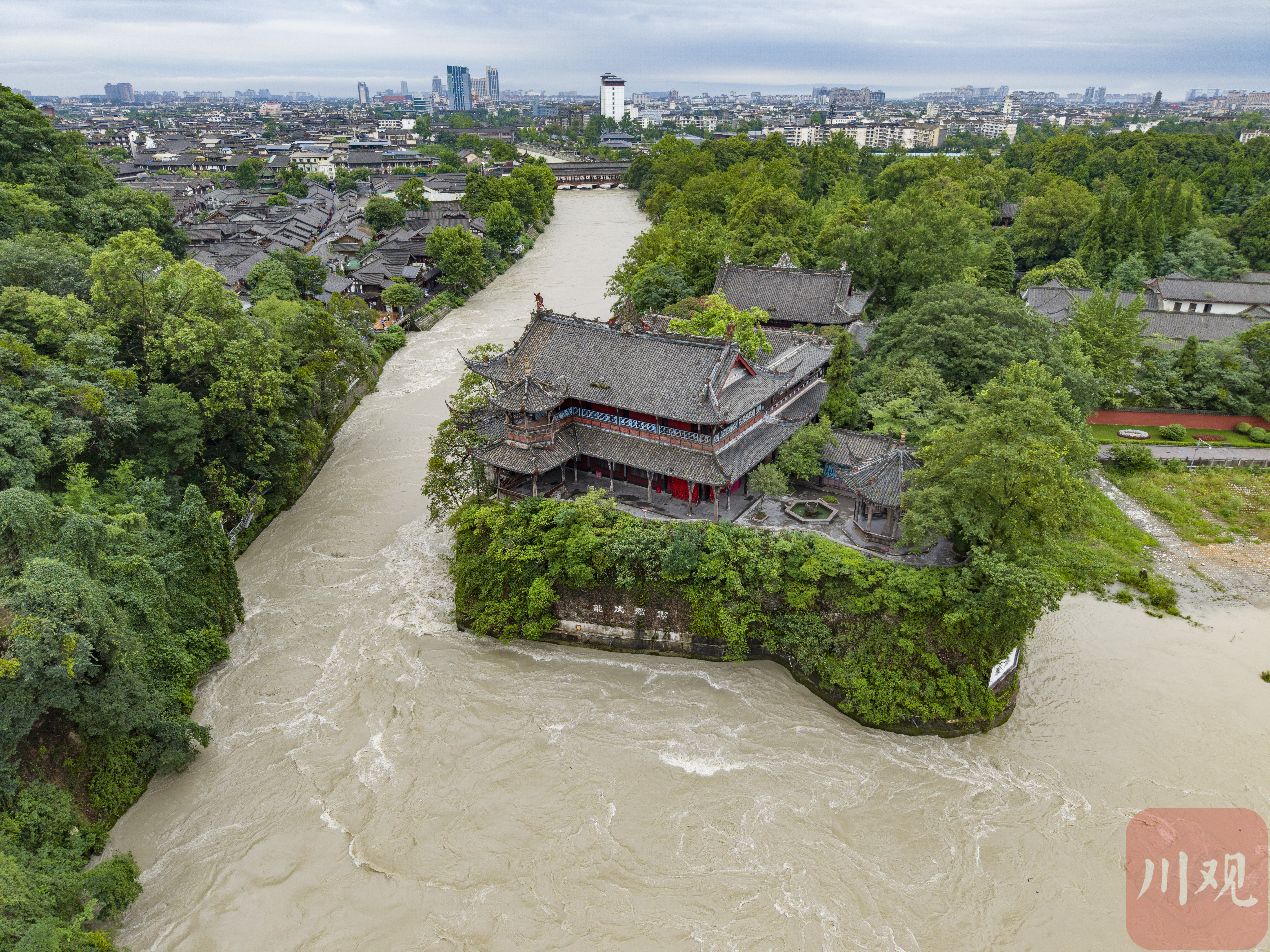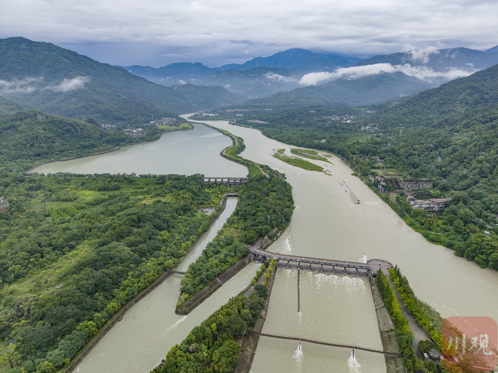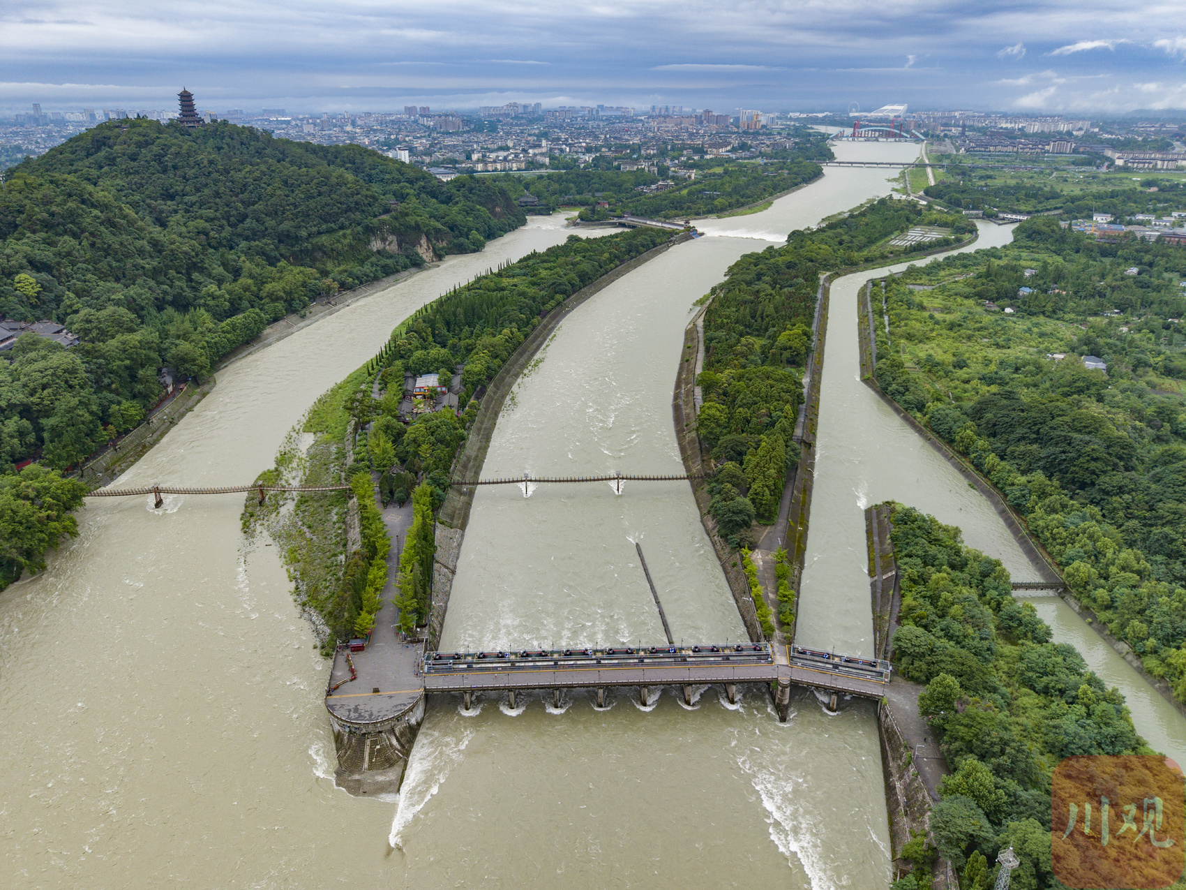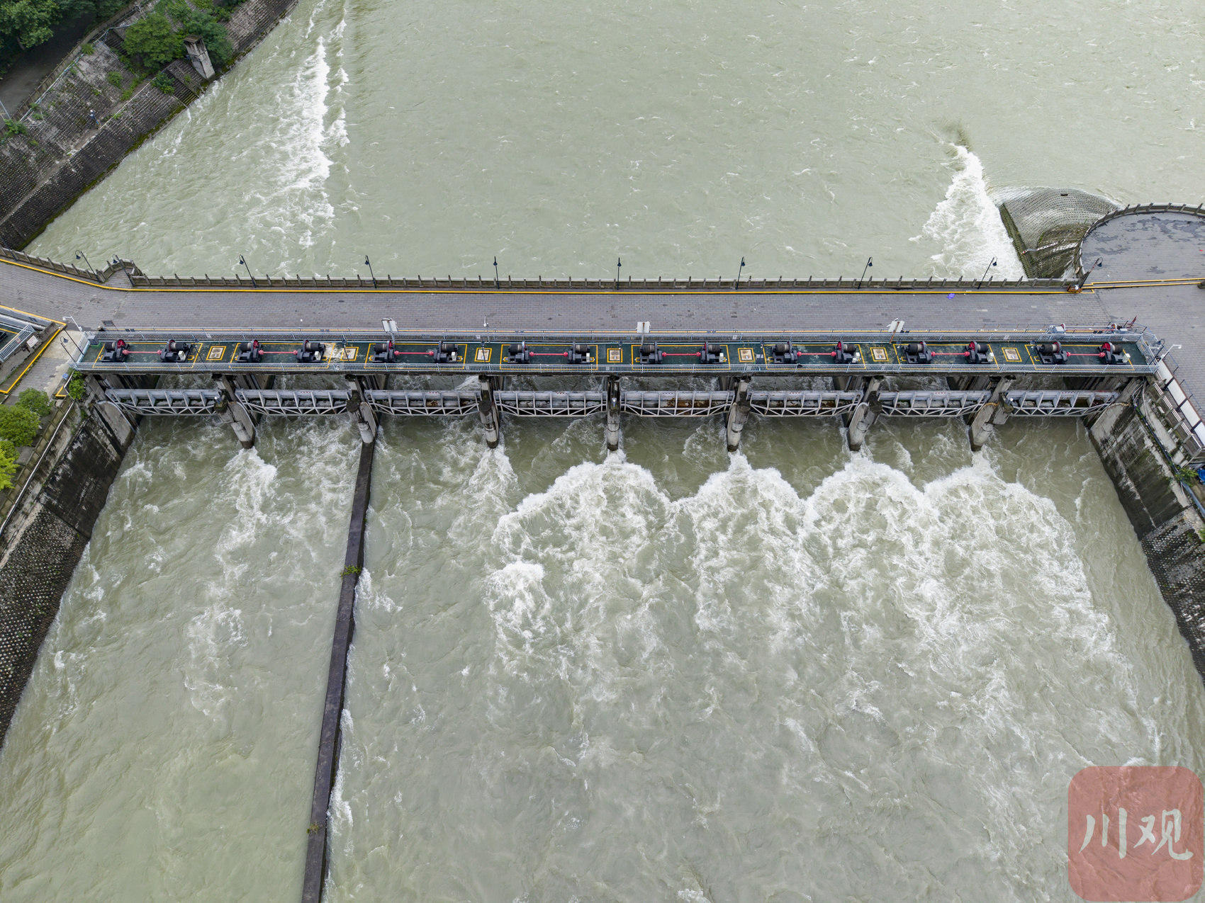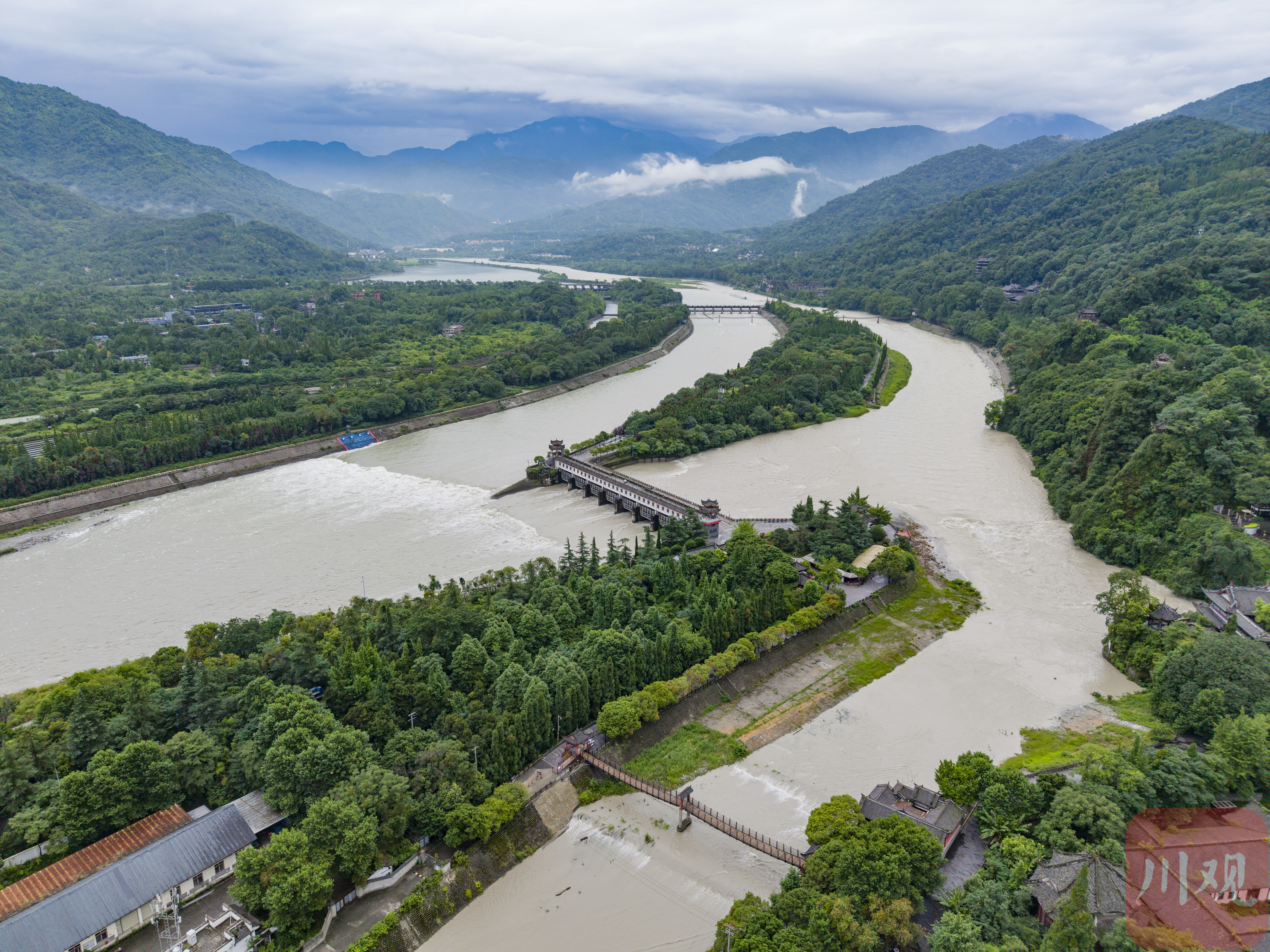 2025年7月4日,都江堰迎来洪峰,岷江水位涨势明显,千年水利工程再现四六分水、自然分流奇观。鱼嘴四六分水,外江闸门、飞沙堰闸门全开,将大部分洪水分流到外江,确保成都平原的安全。