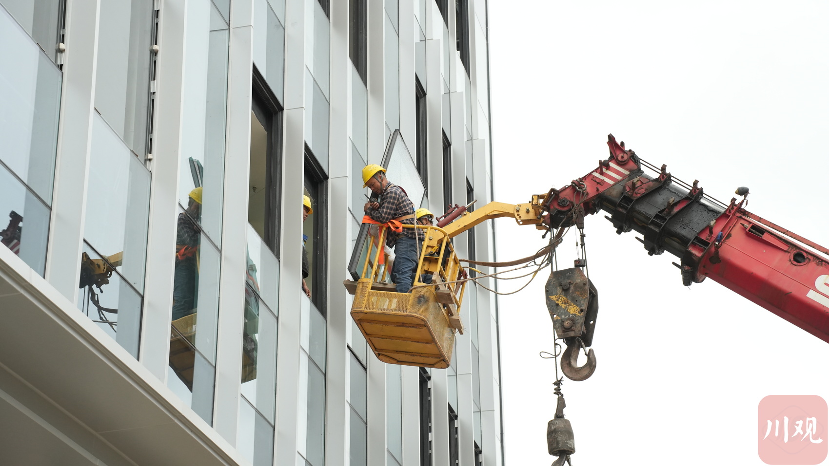 7月4日,宜宾三江新区新型产业示范基地施工现场,运输车辆来回穿梭,工人们忙着栽种绿植、石材铺贴、调试水电设备等工作。在西侧幕墙施工区,随着吊车引擎的阵阵轰鸣,一块幕墙玻璃被缓缓吊起。