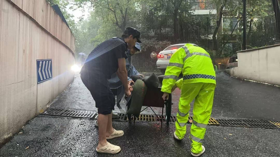 暴雨未至,战鼓先擂。街道闻“汛”即动,应急机制全面激活。领导班子率6支应急分队直插社区,600余名街道社区干部职工、网格员、城管队员、综治队员、物业人员混编成军,展开“拉网式”巡查。指令在雨幕中疾传,险情于动态监测下现形:邮规院家属区停车场水深10厘米、老旧小区管网告急......19处险情报送与处置无缝衔接,分秒之间筑牢全域覆盖的“防护网”。静渝路大面积积水处,市政抽排设备轰鸣入场;倒伏树木旁,警示标志迅速立起;地下车库入口,“沙袋围堵+水泵强排”严阵以待。各点位人员密切关注车库内情况,引导车主按预定路线有序驶离,并对行动不便或有特殊需求的居民提供必要帮助,确保人车安全。暴雨倾盆,一张高效联动的责任网络,将险情牢牢阻隔在外。