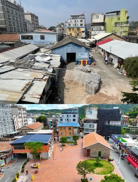 拼版照片:上图为厦门市思明区滨海街道黄厝社区塔头社城中村大广场改造前的景象(资料照片);下图为2024年6月27日拍摄的同一地点改造后的景象(新华社记者 周义 摄,无人机照片)。新华社发