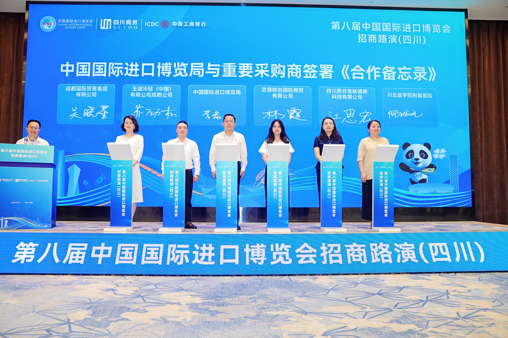 活动现场,中国国际进口博览局与成都国际贸易集团有限公司、四川西非医联健康科技有限公司、忠源联创国际商贸有限公司、玉湖冷链食品(成都)有限公司、川北医学院附属医院分别签署了重要采购商合作备忘录。
