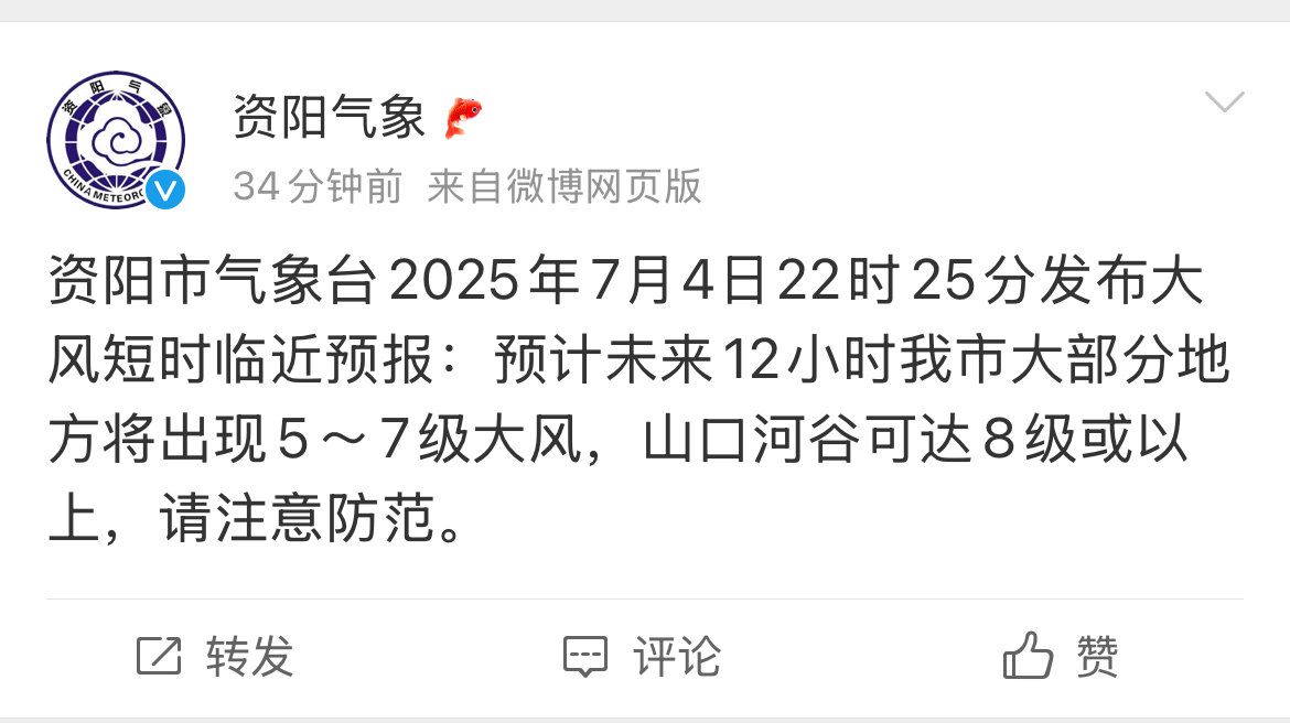 2025年7月4日22时25分,资阳市气象台发布大风短时临近预报:预计未来12小时我市大部分地方将出现5~7级大风,山口河谷可达8级或以上,请注意防范。
