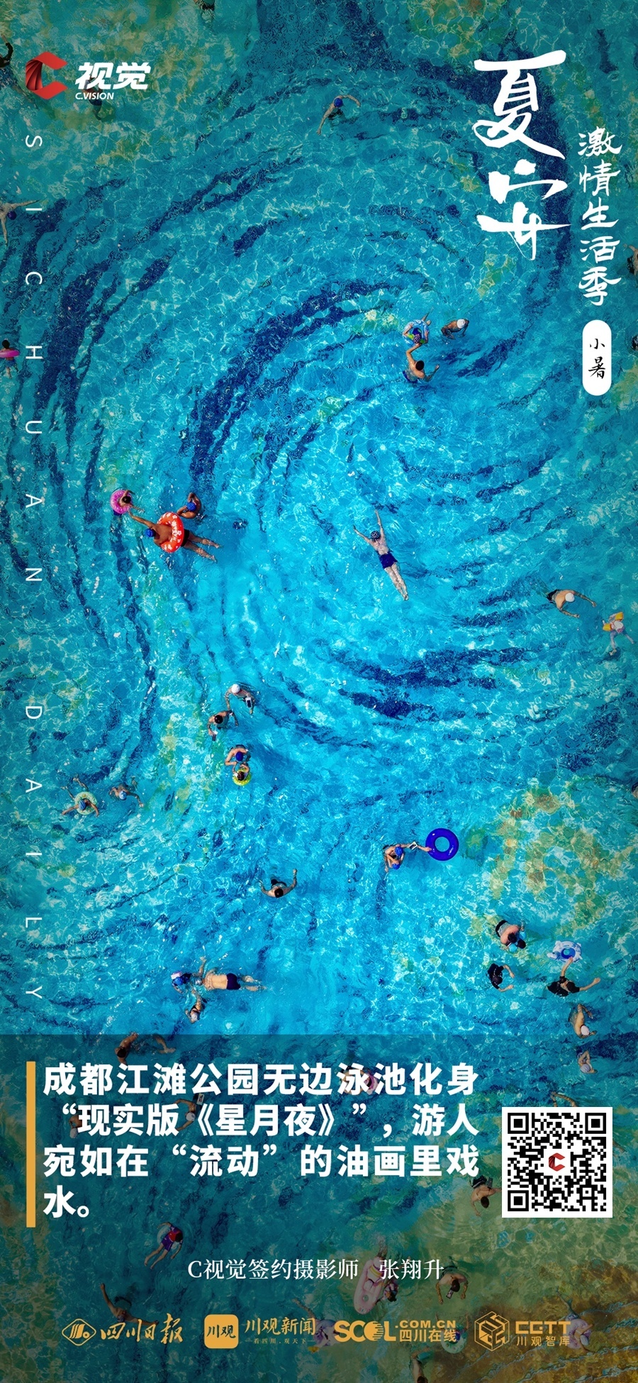 成都江滩公园无边泳池化身“现实版《星月夜》”,游人宛如在“流动“的油画里戏水。(C视觉签约摄影师 张翔升 摄)