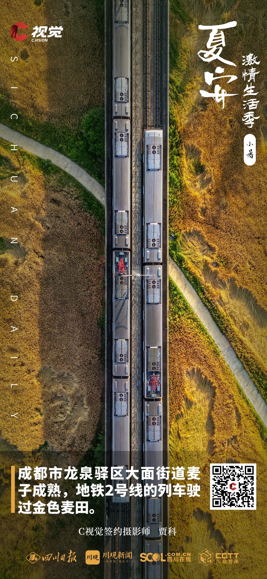 成都市龙泉驿区大面街道麦子成熟,地铁2号线的列车驶过金色麦田。(C视觉签约摄影师 贾科 摄)