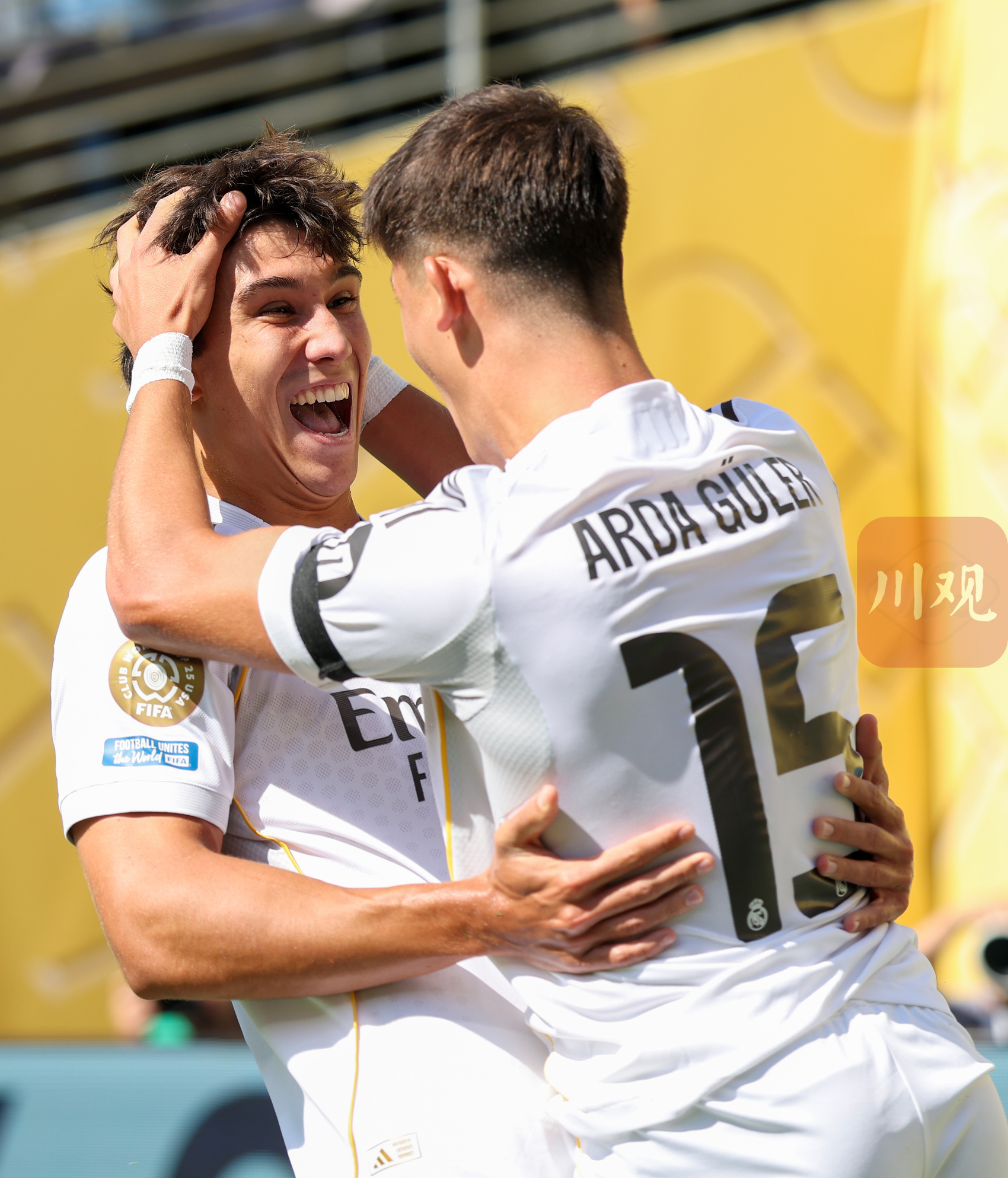 贡萨洛·加西亚进球后与队友阿尔达·居莱尔庆贺。