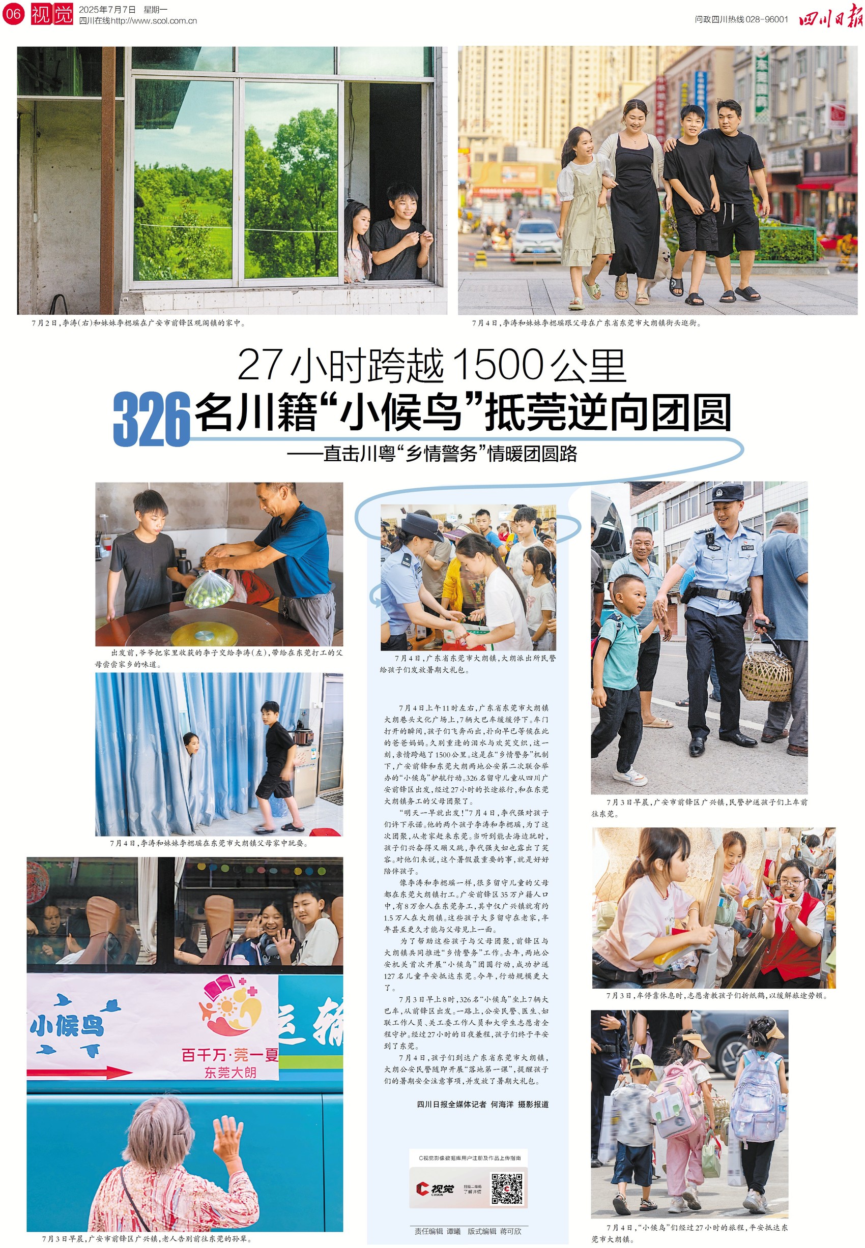 7月4日上午11时左右,借助川粤“乡情警务”机制,由广安前锋和东莞大朗两地公安第二次联合举办的“小候鸟”护航行动圆满完成。326名留守儿童从四川广安前锋区出发,经过27小时的长途旅行,得以在东莞大朗镇务工的父母团聚。关注今日六版,了解详情。