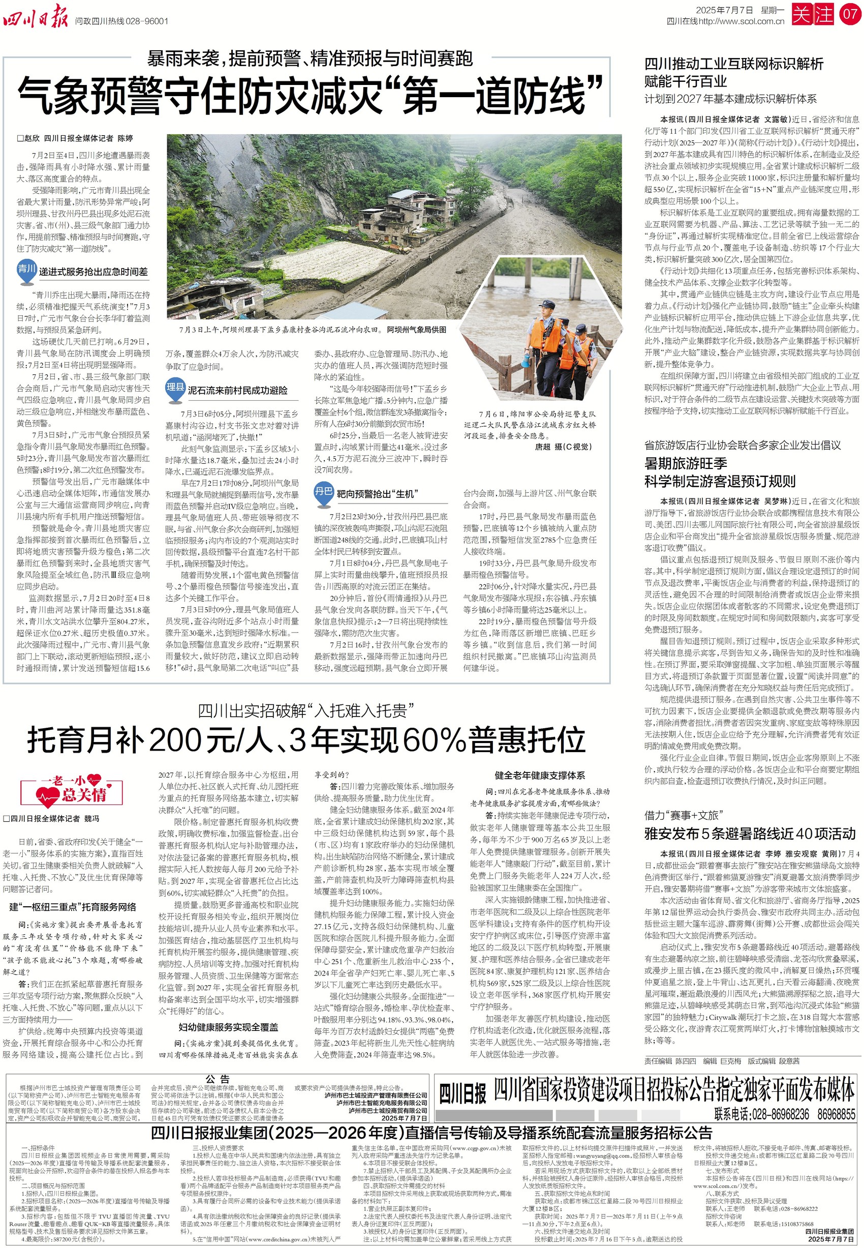 7月2日至4日,四川多地遭遇暴雨袭击,此番强降雨具有小时降水强、累计雨量大、落区高度重合的特点,省内多地防灾减灾形势严峻。广元市青川县受强降雨影响,出现全省最大累计雨量;阿坝州理县、甘孜州丹巴县出现多处泥石流灾害。关注今日七版,看省、市(州)、县三级气象部门如何通力协作,用提前预警、精准预报与时间赛跑,守牢防灾减灾“第一道防线”。