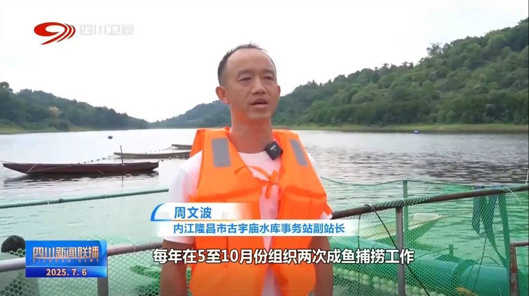 内江隆昌市古宇庙水库事务站副站长 周文波:我们一直坚持轮捕轮放的原则,每年在五至十月份组织两次成鱼捕捞工作,每次时间在一个月左右,成鱼产量每次在15万斤左右,这也是保护和改善水质的重要环节。