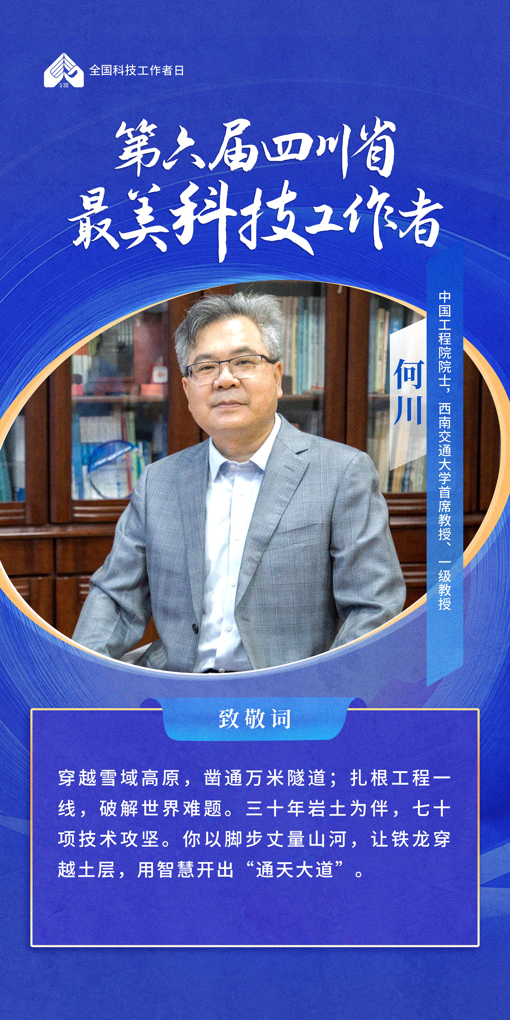获评第六届四川省“最美科技工作者”,何川的感言是:这既是一份荣誉,也是一份责任。科技兴则民族兴,科技强则国家强,科技自立自强是国家强盛之基、安全之要。作为一名科技工作者,我将始终牢记肩上的责任与担当,大力弘扬科学家精神,继续把人生目标、人生规划锚定在祖国的伟大事业上,勇于创新、潜心研究,与广大科技工作者们一道把论文写在祖国大地上,不断为发展新质生产力和实现高水平科技自立自强贡献力量。