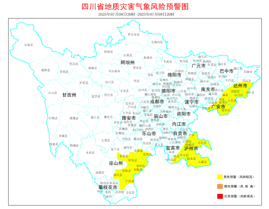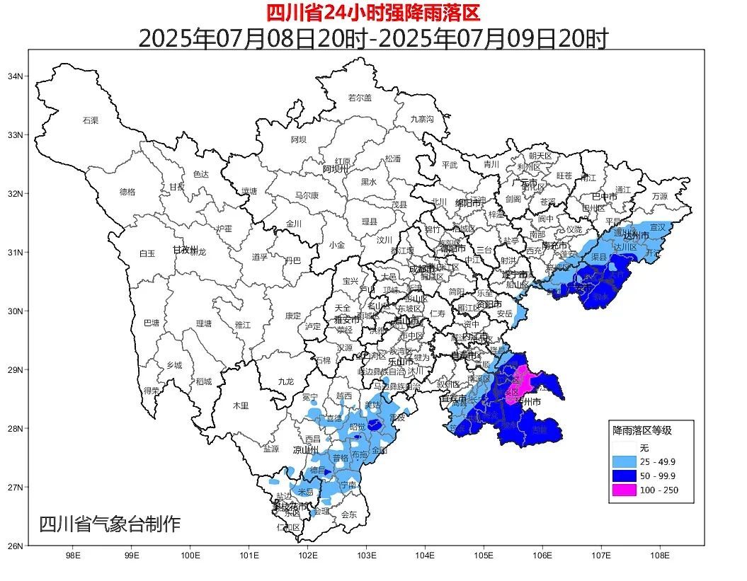 四川省气象台15时50分发布暴雨蓝色预警,7月8日20时到9日20时:泸州、广安2市,达州南部、宜宾东部及凉山州东部北部有大雨到暴雨(雨量40~80毫米),局部大暴雨,最大累计雨量150~180毫米,最大小时雨强40~60毫米,局部伴有短时雷雨大风。(详情:大雨到暴雨,局部大暴雨!四川继续发布暴雨蓝色预警)
