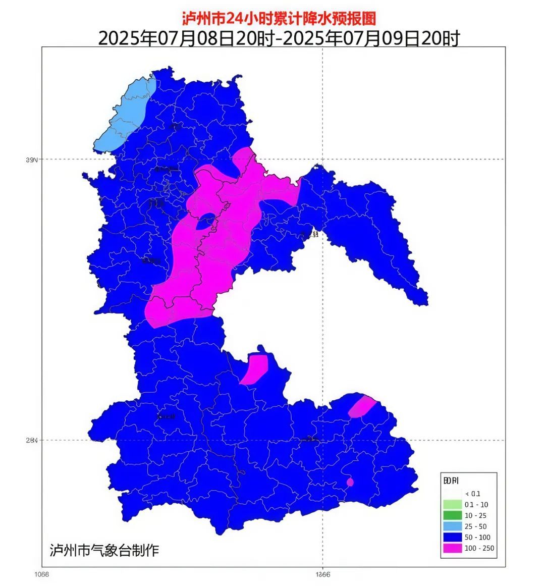 7月8日16时,泸州市气象台发布暴雨蓝色预警:预计7月8日傍晚到9日白天泸州市各区县将出现一次暴雨天气过程,雨量普遍大雨到暴雨(40~80毫米),局部地方累计雨量超过 140 毫米,最大小时雨量 40~70毫米,过程伴有雷电、短时强降水、5~8级阵风等强对流天气。