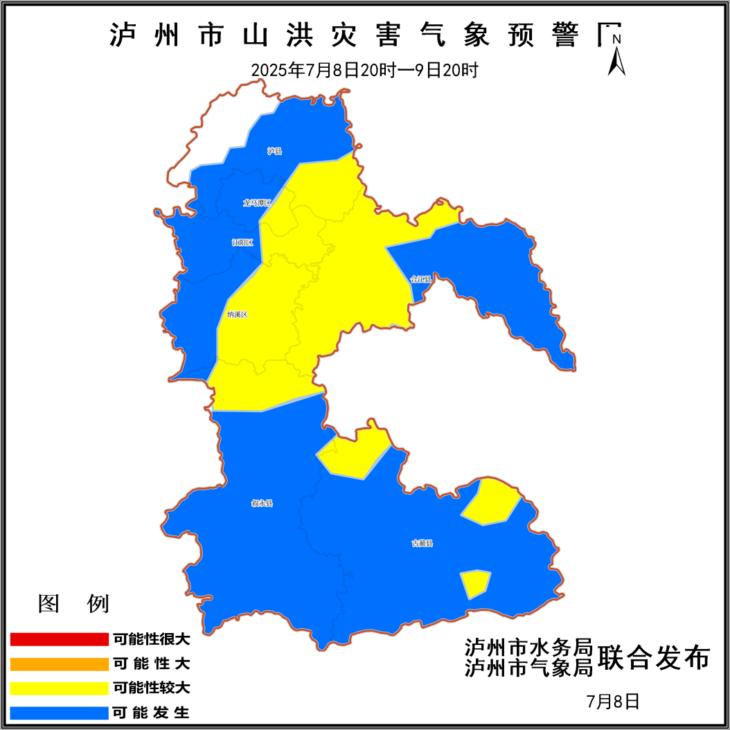 同一时间,泸州市水务局、泸州市气象局联合发布山洪灾害黄色预警:预计7月8日傍晚到9日白天泸州市各区县将出现一次暴雨天气过程,雨量普遍大雨到暴雨(40-80毫米),局部地方累计雨量超过140毫米,最大小时雨量40-70毫米。泸州市纳溪、合江、江阳、龙马潭、叙永、泸县、古蔺等7个区县发生山洪灾害可能性较大。