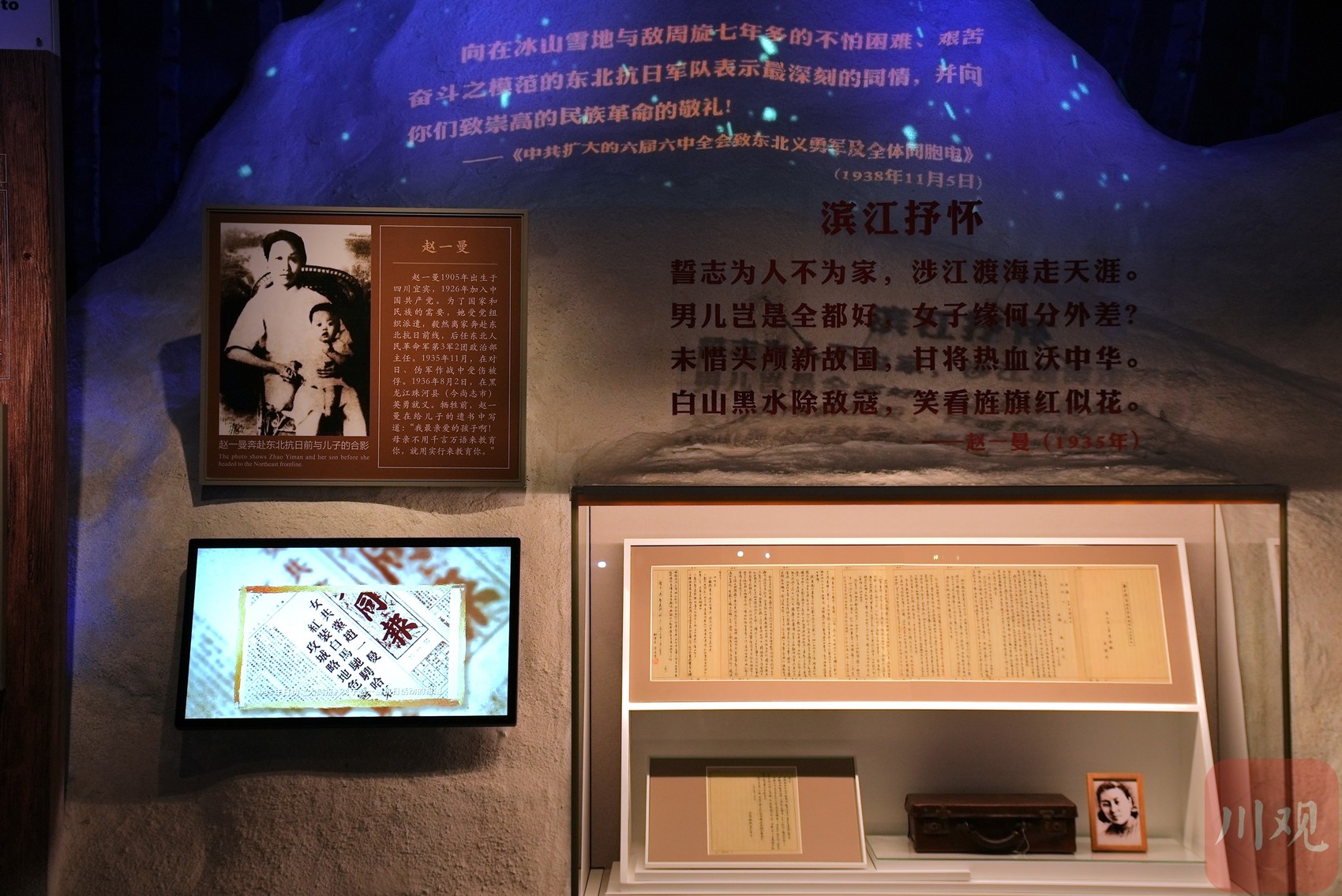 展厅内一组按时轴排列的历史场景照片,勾勒出这位女英雄的革命轨迹:1926年宜宾女中旧址见证她早年接受进步思想的青葱岁月;1933年哈尔滨电车工人大罢工遗址记录她组织工人运动的坚毅身影;1934年珠河县侯林乡(今尚志市长寿乡一曼村)的土地上,留下她发动群众抗日的足迹。而1935年日伪《大同报》的报道,则从敌方视角印证了她令敌人闻风丧胆的抗日活动。