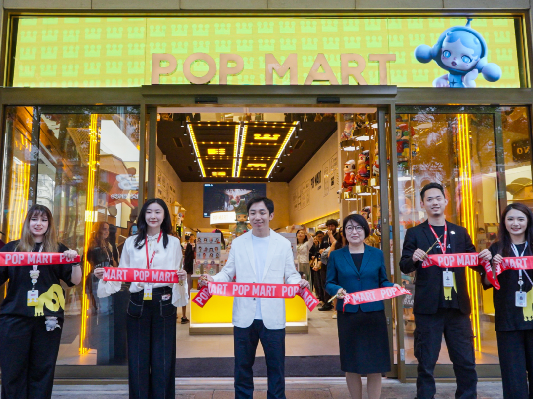 泡泡玛特英国伦敦牛津街店6月22日开业现场,泡泡玛特国际集团创始人、董事长兼CEO王宁(左三)亮相剪彩仪式。图据受访者。