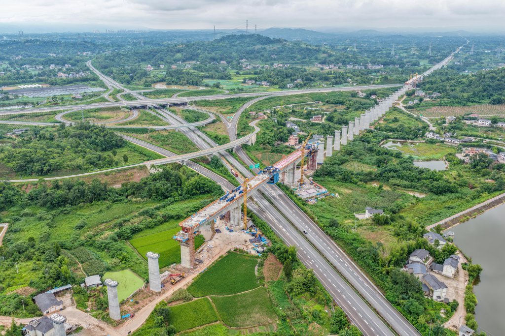 这是7月8日拍摄的成渝中线高铁土桥枢纽互通双线特大桥建设现场(无人机照片)。