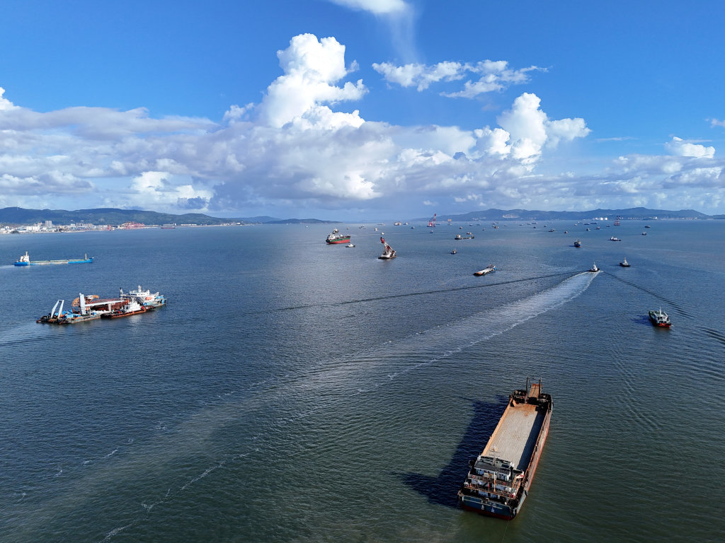 7月6日,一批海上作业工程船舶进入浙江省温州市乐清湾内停泊(无人机照片)。