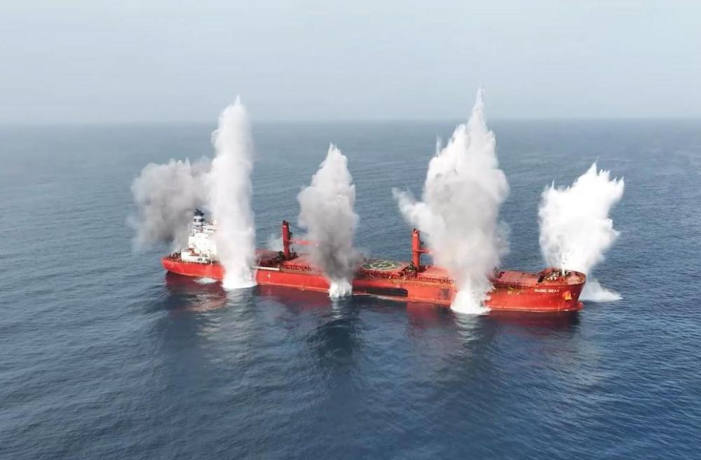 也门胡塞武装8日公布的“魔法海洋”号沉没的影像。新华社发(胡塞媒体中心供图)