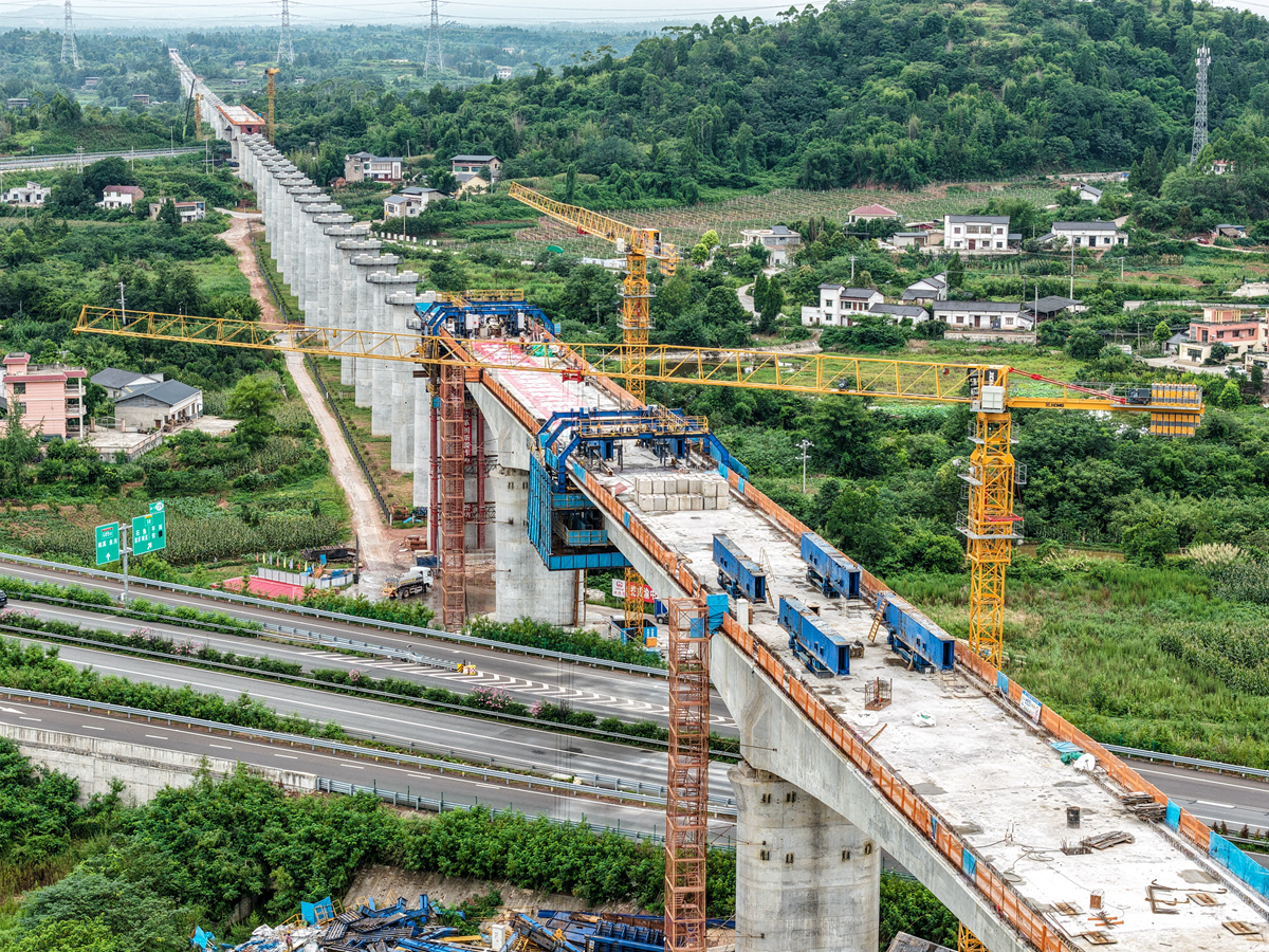 ▷8日,由中铁五局承建的成渝中线高铁土桥枢纽互通双线特大桥连续梁顺利合龙。该连续梁全长约242米,是成渝中线高铁重庆段跨度最大的连续梁。