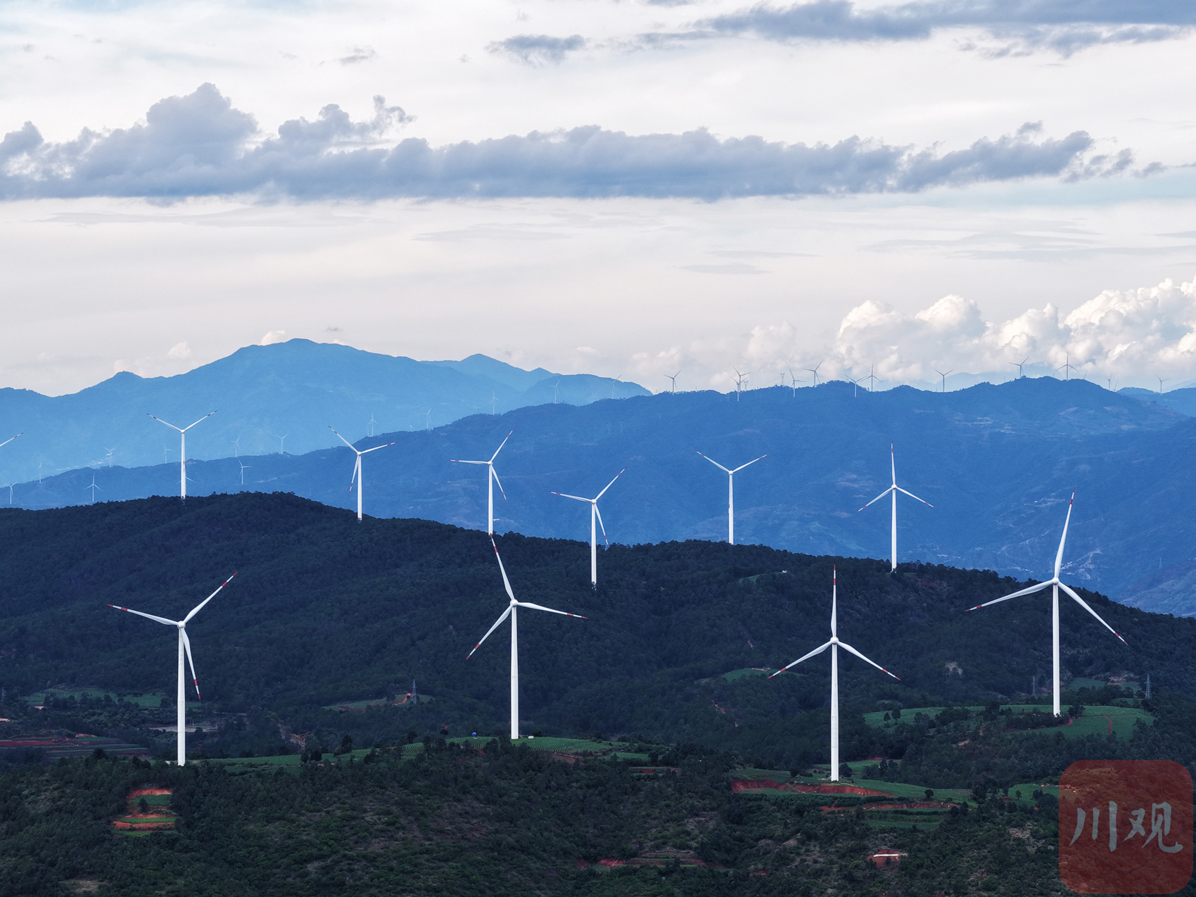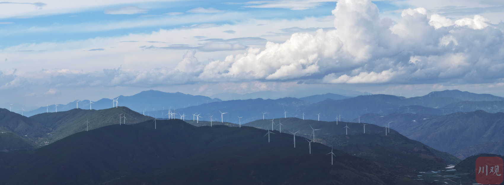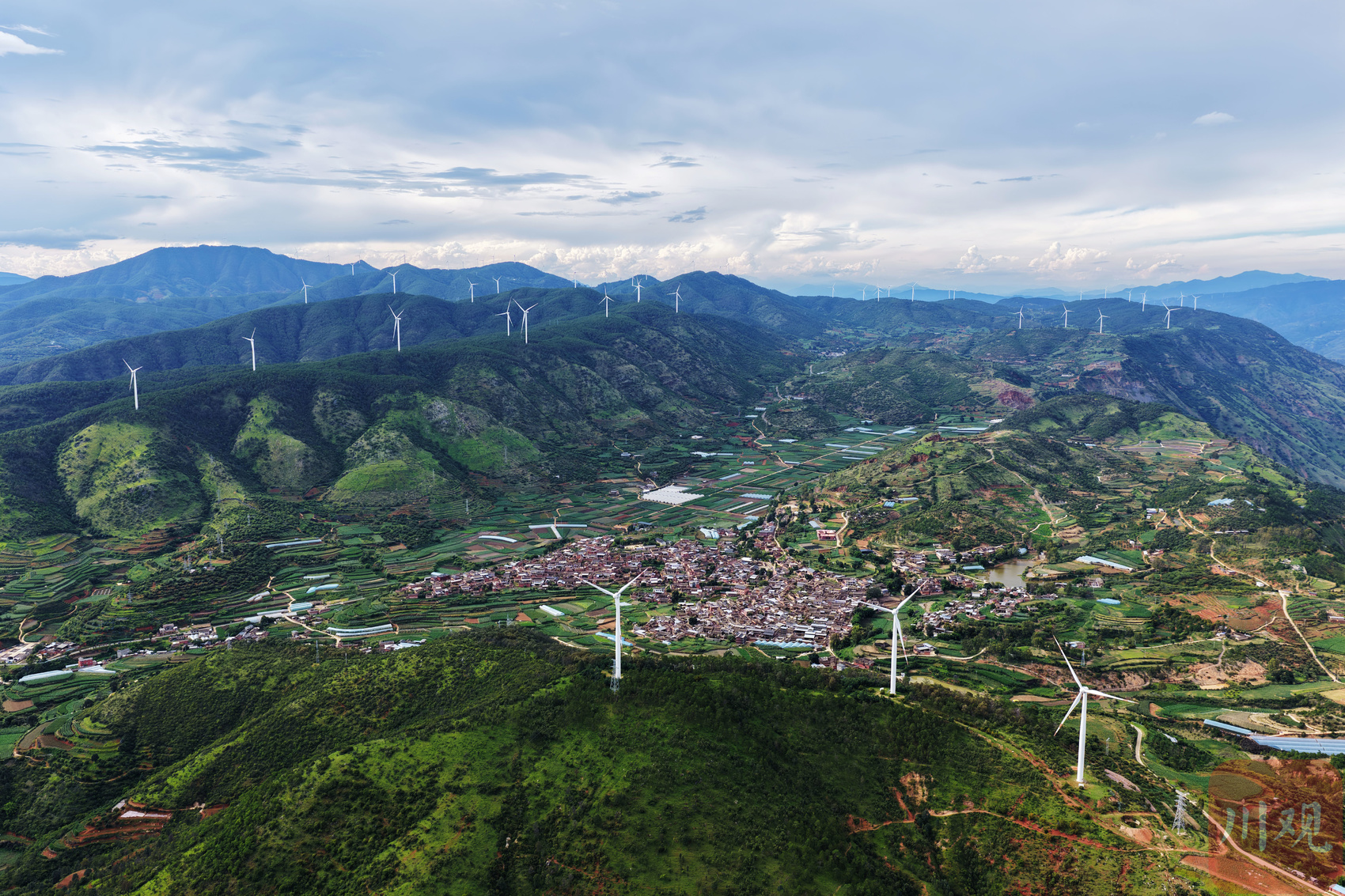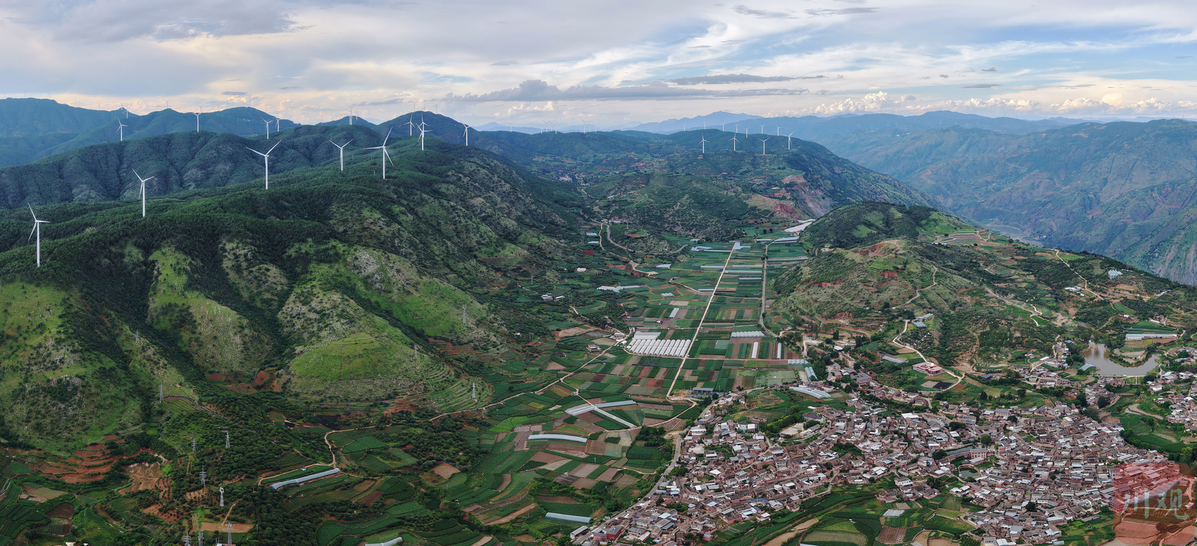 迤沙拉村附近的山脊上,一座座风电机组迎风转动。