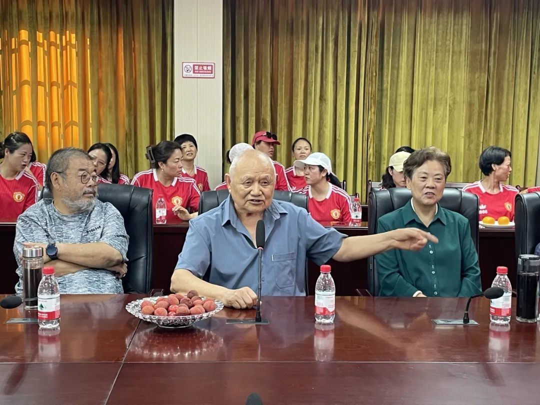 7月5日,在资中县教体局会议室内,初代资中背篼女足与新生代女足欢聚一堂,大家畅所欲言,交流心得体会。会场上,县教体局专职督学邱波向大家介绍资中女足的发展历程,展示PPT的大屏幕上,一张张老照片定格资中背篼女足的青春模样,见证着曾经的辉煌,那些和照片上的她们同样稚嫩的脸庞认真聆听观看。