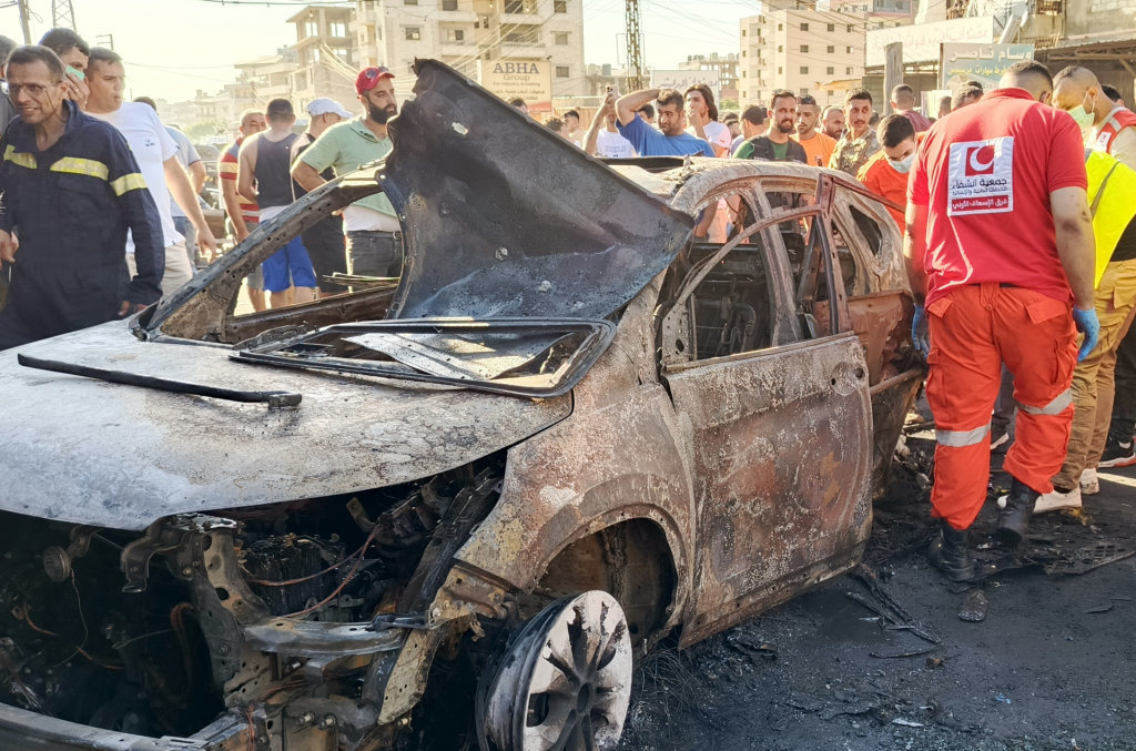 7月8日,人们在黎巴嫩北部城市的黎波里查看被以色列袭击的车辆(手机照片)。