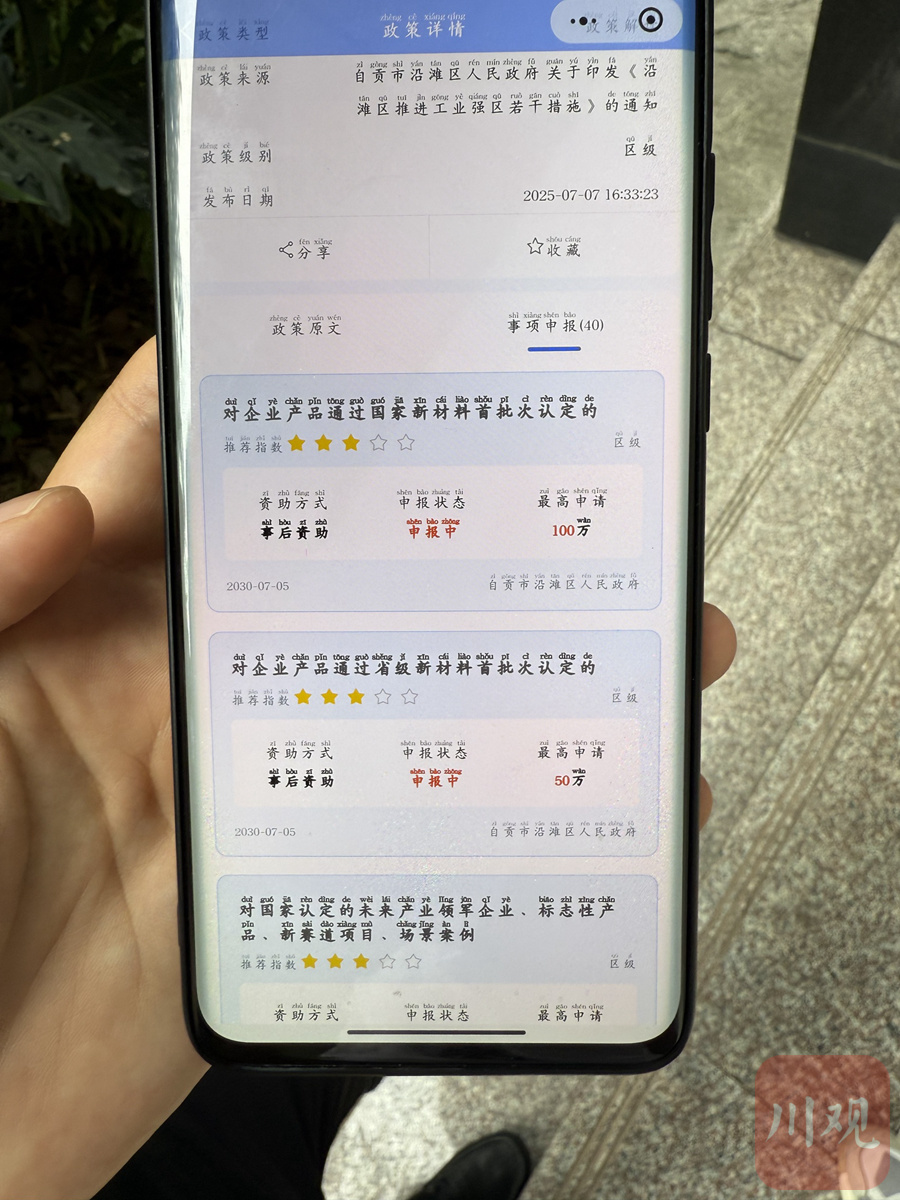 “走访了辖区内众多企业,听取了大家的心声,我们在省内率先推出一款‘计算器’。” 在沿滩区民营企业法治服务中心,回应专家组疑问时,区委常委、统战部部长王揖辉点开手机上的小程序“政策计算器”:“企业动动手指就能适配政策。”