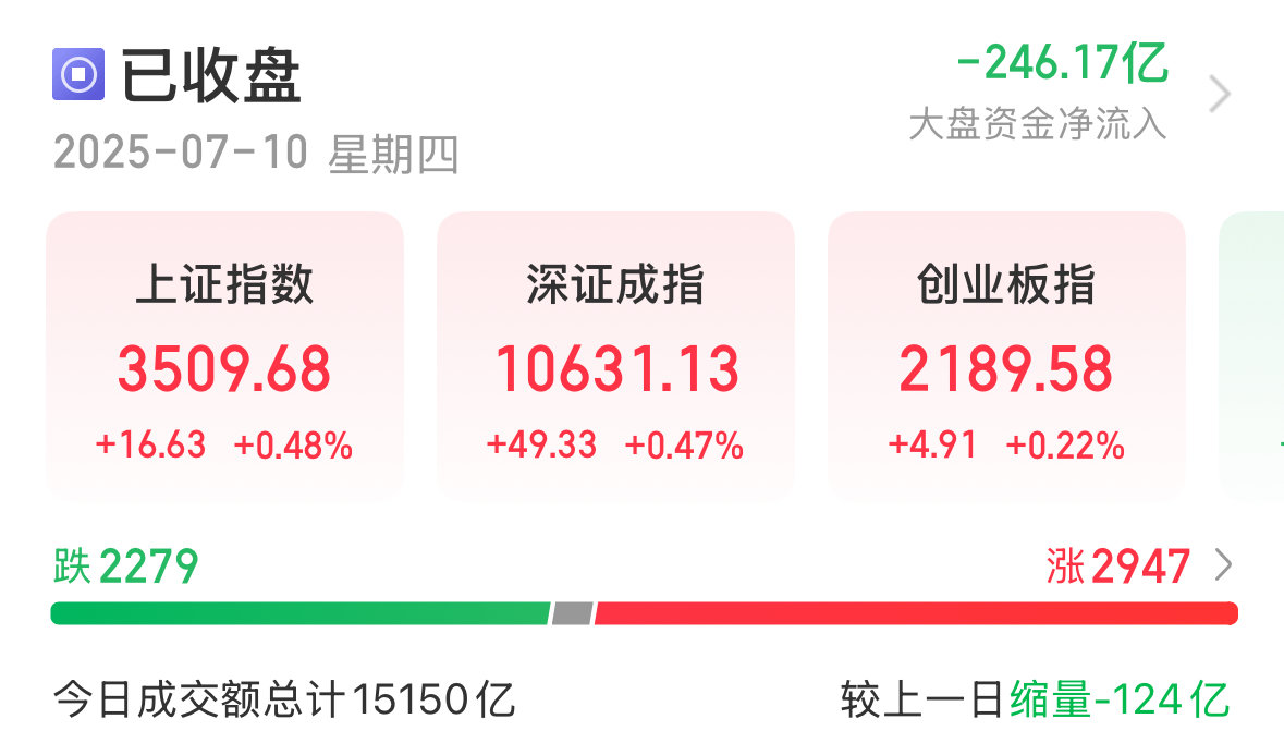 7月10日,沪指再次发起冲锋,强势站上3500点,盘中一路“狂飙”至3526.59点。自本周二起,沪指已连续三日刷新纪录。A股市场“红旗飘飘”,三大指数集体上涨,截至收盘,沪指涨0.48%,收报3509.68点;深成指涨0.47%,收报10631.13点;创业板指涨0.22%,收报2189.58点。全市场成交额15150亿元,较上日缩量124亿元。全市场超2900只个股上涨。