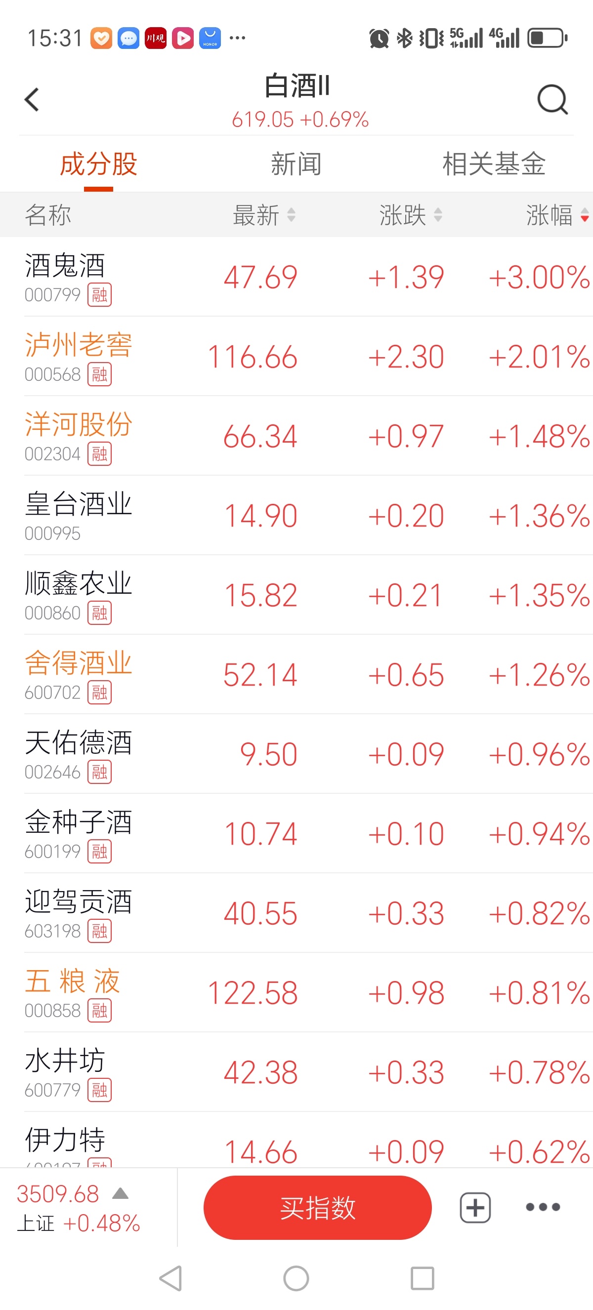 国金证券板块指数显示,白酒指数以微涨0.69%收盘,延续本周小幅反弹走势。20家上市白酒企业中,贵州茅台、山西汾酒、五粮液等多只行业龙头股主力资金净流入,酒鬼酒涨幅3%为当日最高,ST岩石为唯一下跌的股票。