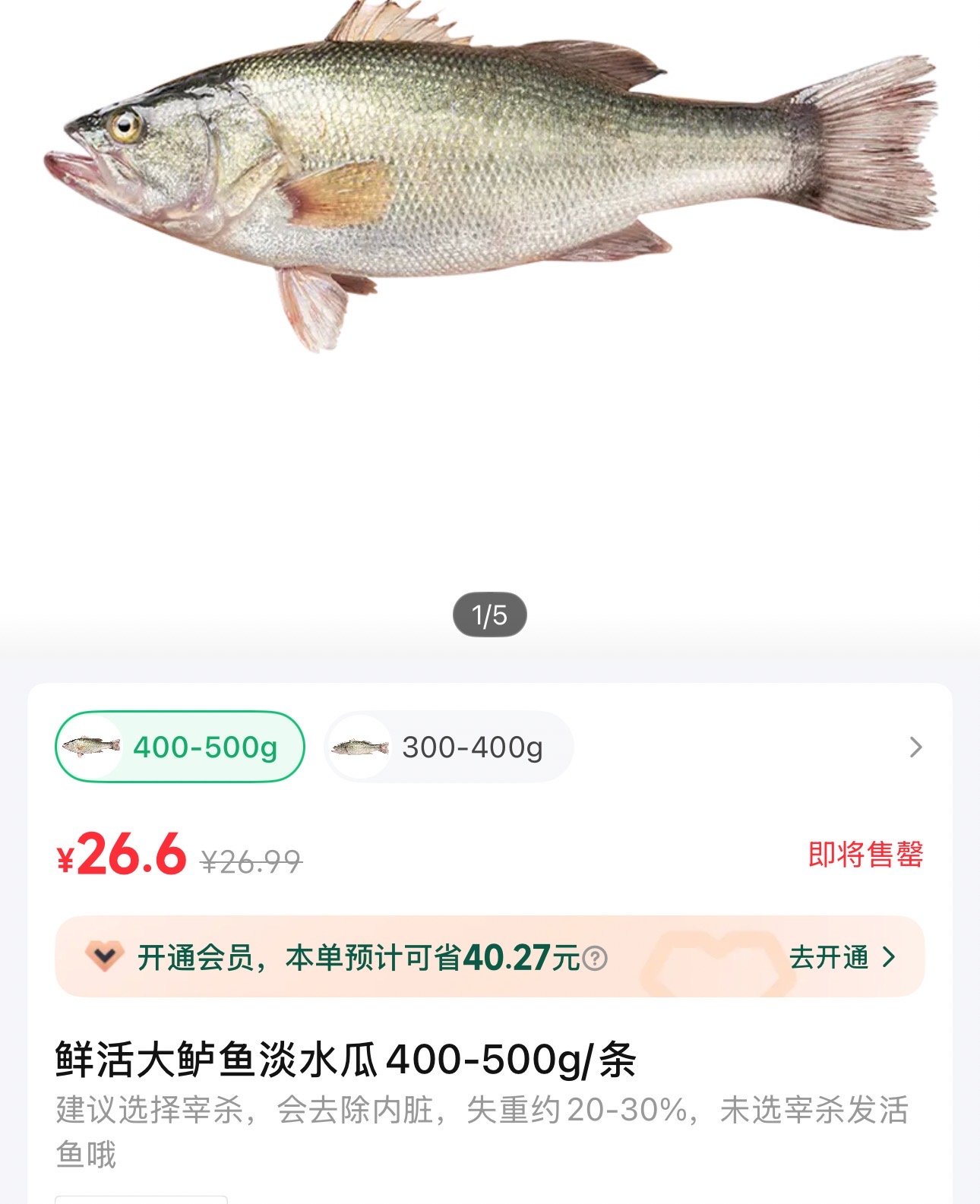 某农产品配送平台,一条400至500克的鲈鱼标价26.6元。