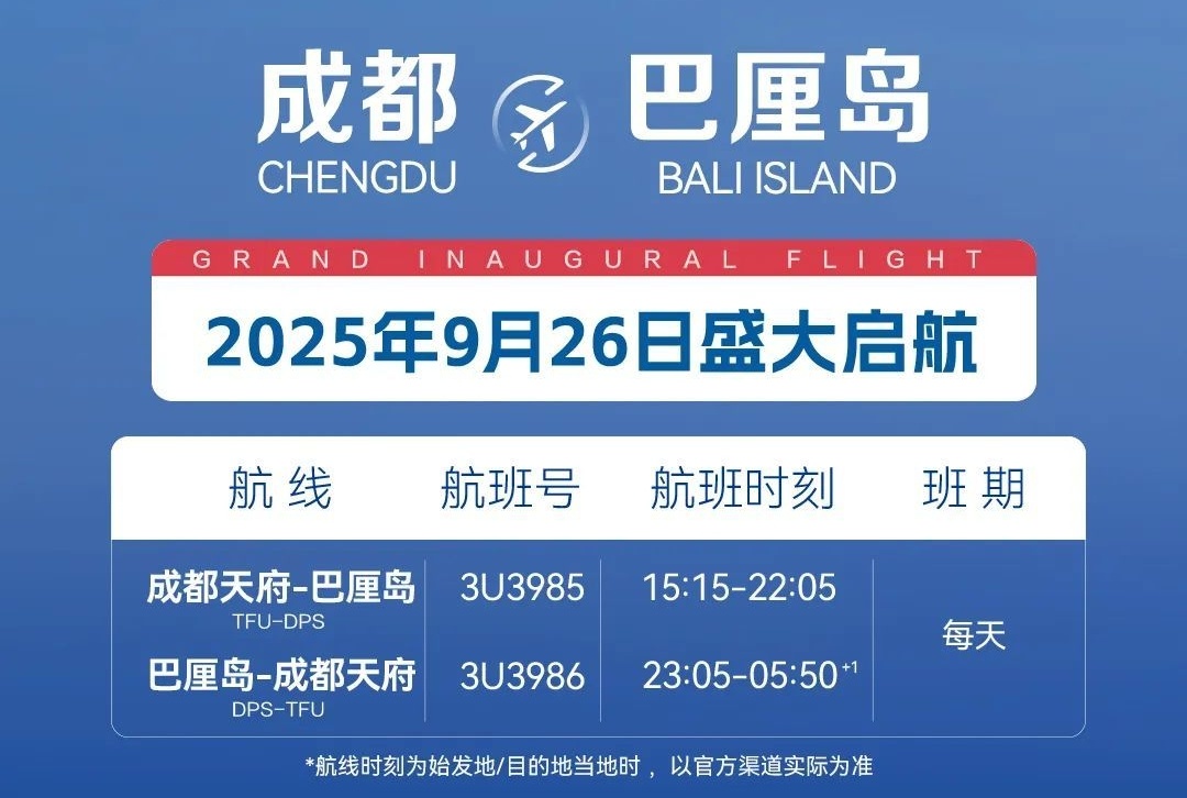 其中,成都=巴厘岛航线计划于9月26日正式开通,每日执飞1班。巴厘岛作为全球热门旅游目的地,以其碧海蓝天,热带风情和独特文化景观吸引着众多游客。而此次航线的开通,将为今年“十一”黄金周出行增添新选项。