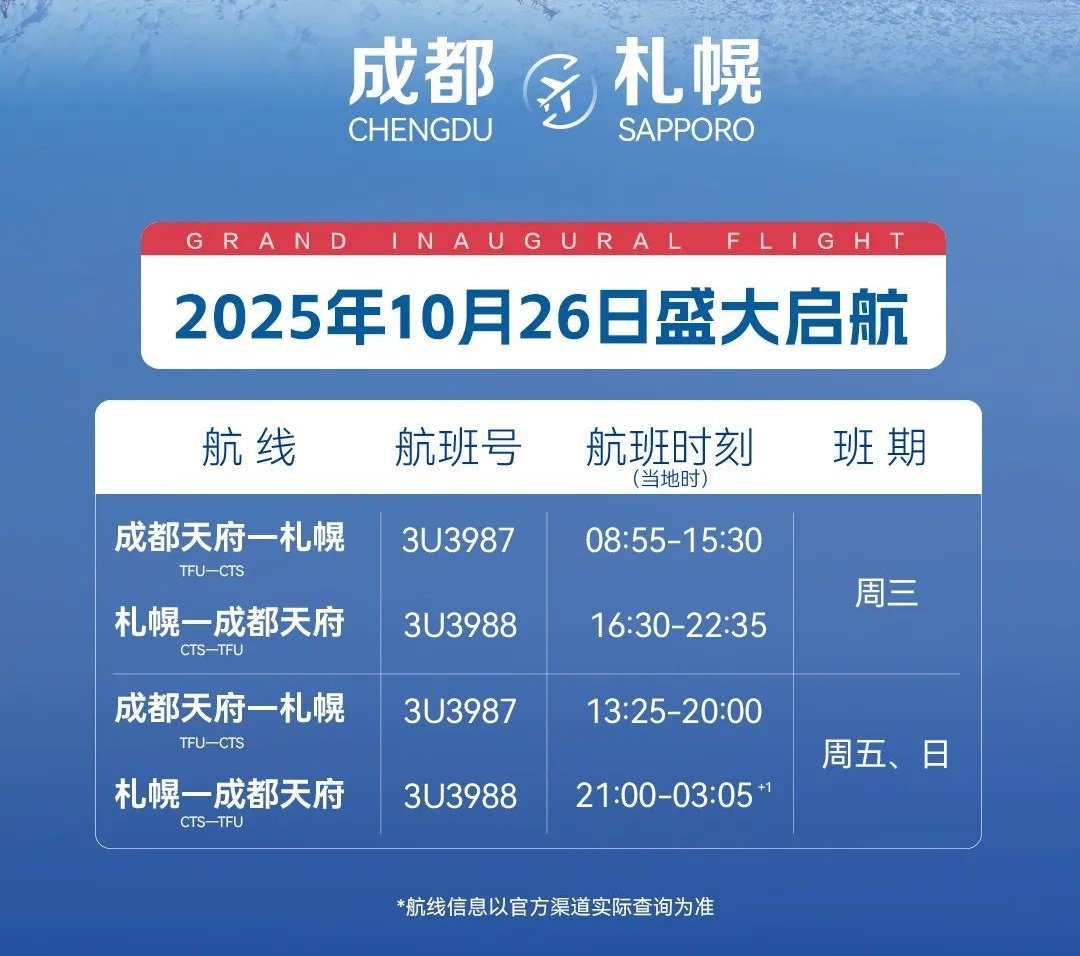 此外,川航将于10月26日恢复成都=札幌航线,每周执飞3班。该航线最初于2020年1月开通,是连接成都与北海道的重要空中通道,此次恢复后,为滑雪爱好者及冬季旅游提供了便捷通道。目前,川航在日本已运营成都往返东京、大阪的每日1班航线,此次札幌航线的恢复将丰富其日本航线网络。