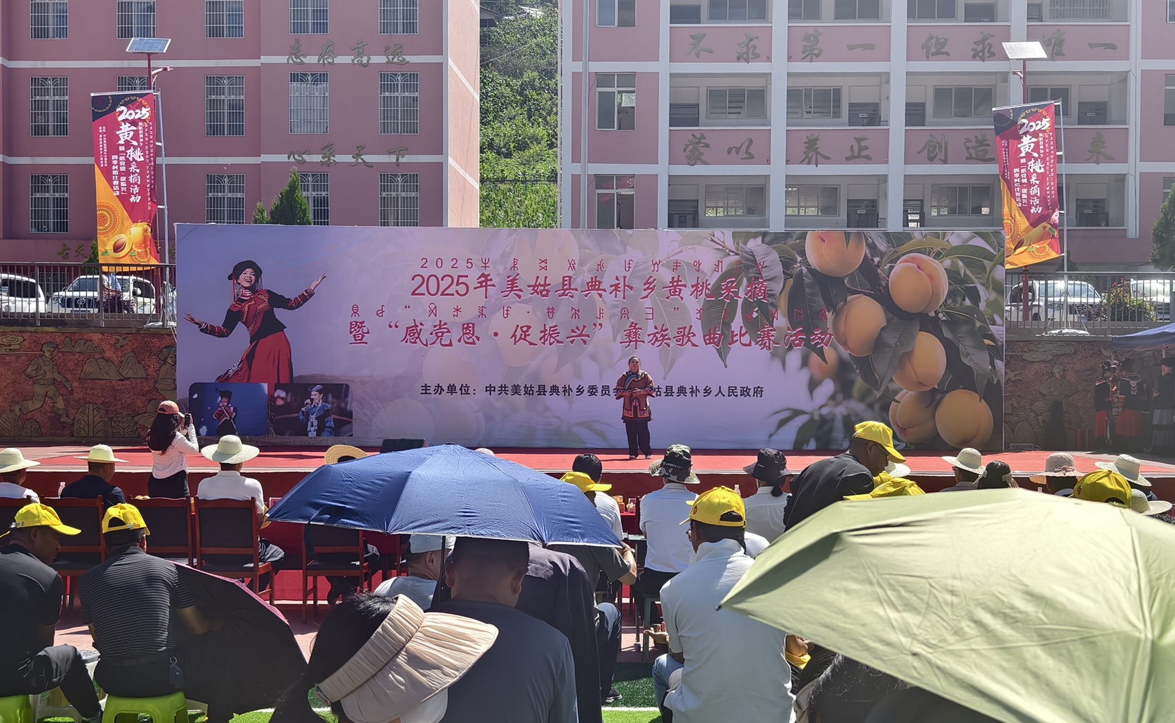 7月11日上午,2025年美姑县典补乡黄桃采摘暨“感党恩·促振兴”彝族歌曲比赛活动在典补乡则合姑村农文旅融合示范基地开幕。
