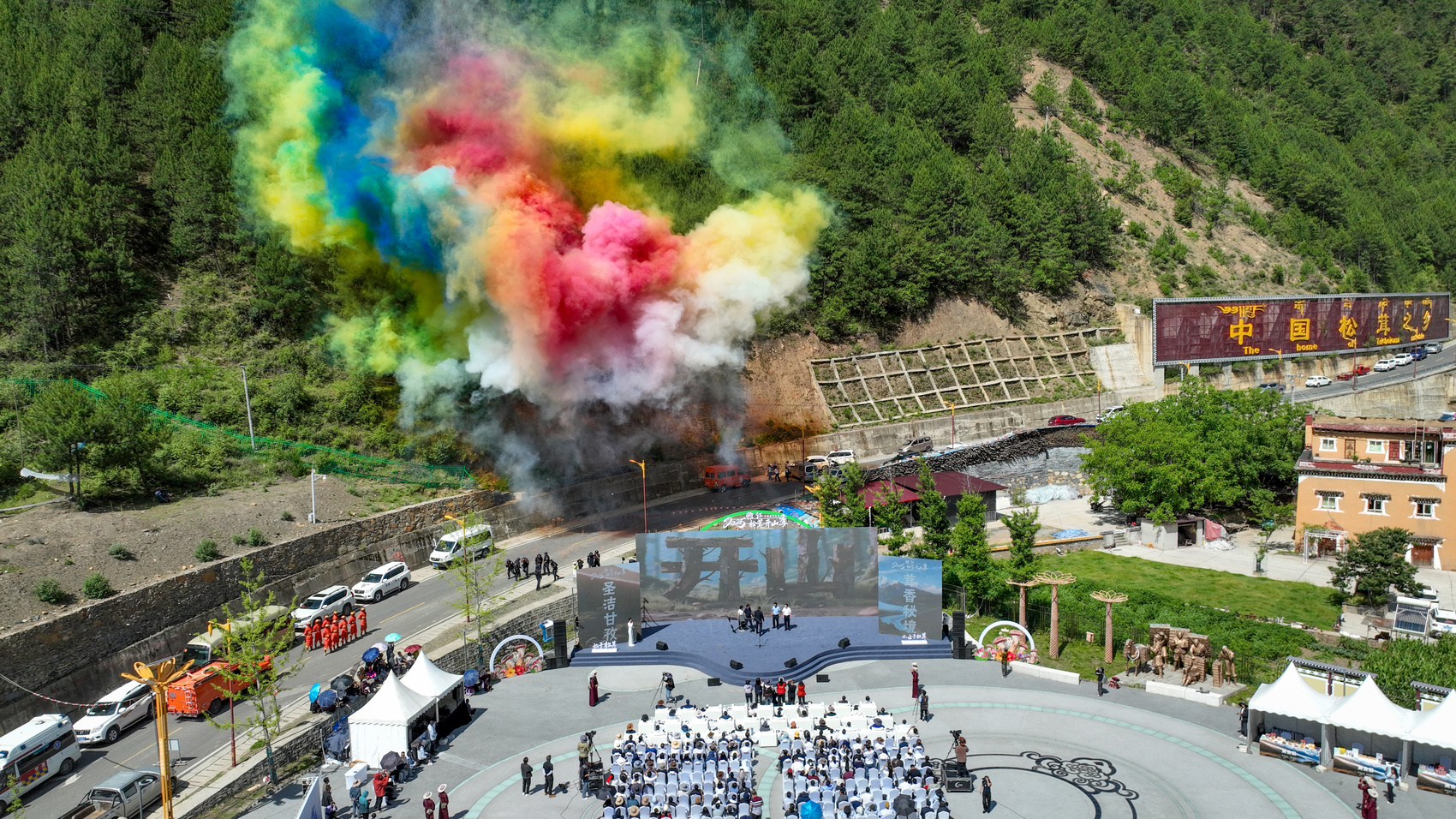 仪式现场融合传统与现代元素:身着“康巴汉子”服饰的机器人与演员同台献艺,318组合演唱的《我们的圣洁甘孜》融入贡嘎雪山等地域符号,雅江县康巴汉子艺术团以独特对脚锅庄展现非遗魅力,布尔甲演唱的《雅江情缘》勾勒国道318沿线风情,县职业学校学生表演的康巴风格踢踏舞彰显青春活力。杭州上城区、宜宾及本土“代言人”通过视频连线表达产业关注。