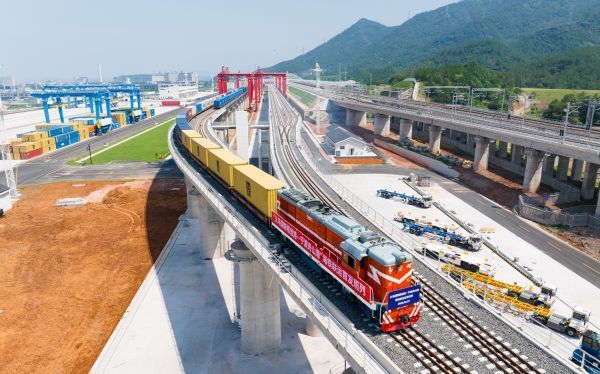 6月27日,81114次海铁联运班列从义乌苏溪集装箱办理站鸣笛启程,驶向世界第一大港宁波舟山港。新华社发 (胡锦渠 摄)
