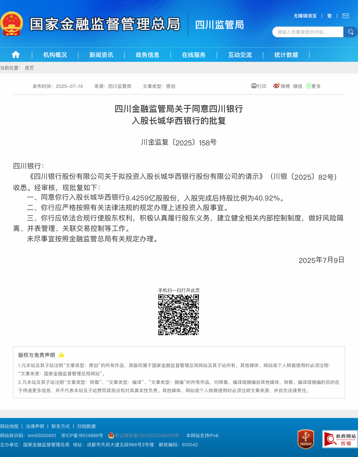 7月14日,四川金融监管局官网挂出文件,批复同意四川银行入股长城华西银行9.4259亿股股份,入股完成后,四川银行持股比例为40.92%。