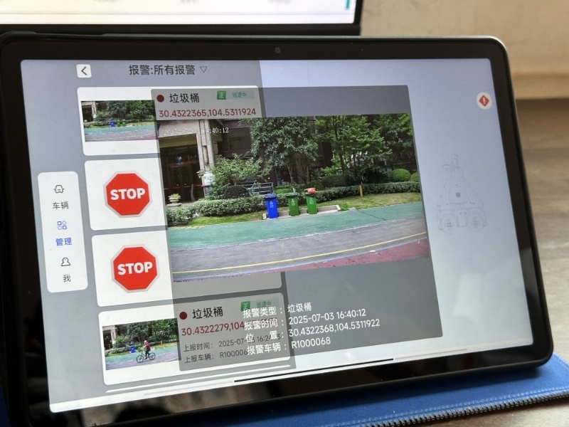 当“阳阳”走到小区10号单元楼下时,它发现有垃圾从垃圾桶里溢出,便及时挺起“胸脯”拍照并上传相关讯息。小区监控室收到讯息后,马上安排保洁员进行处置。