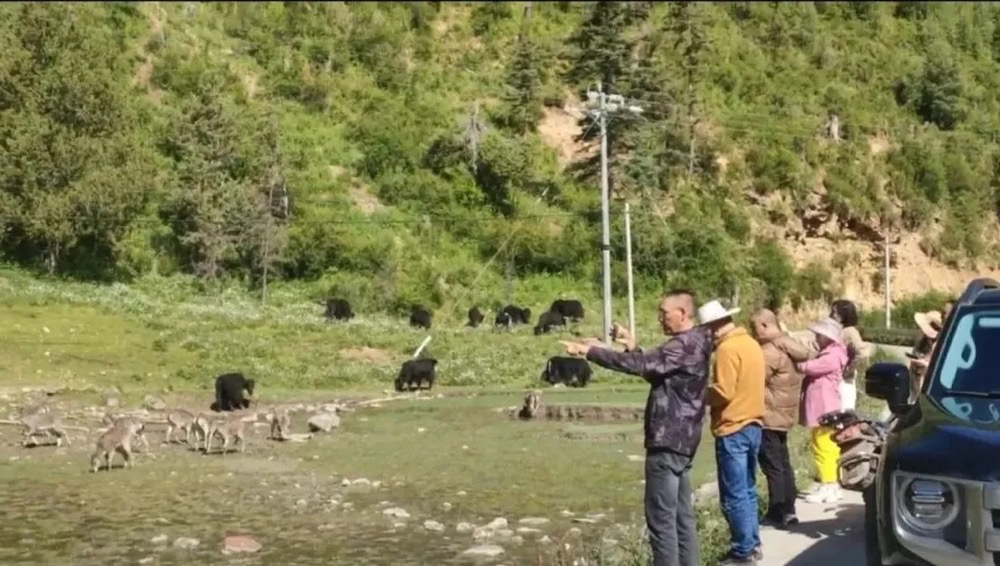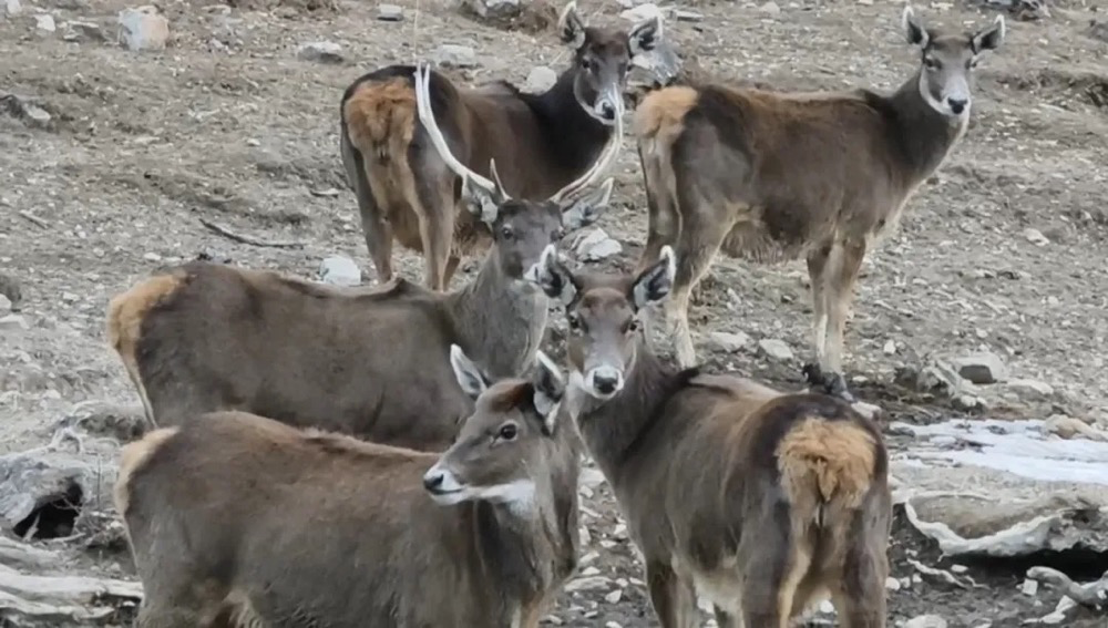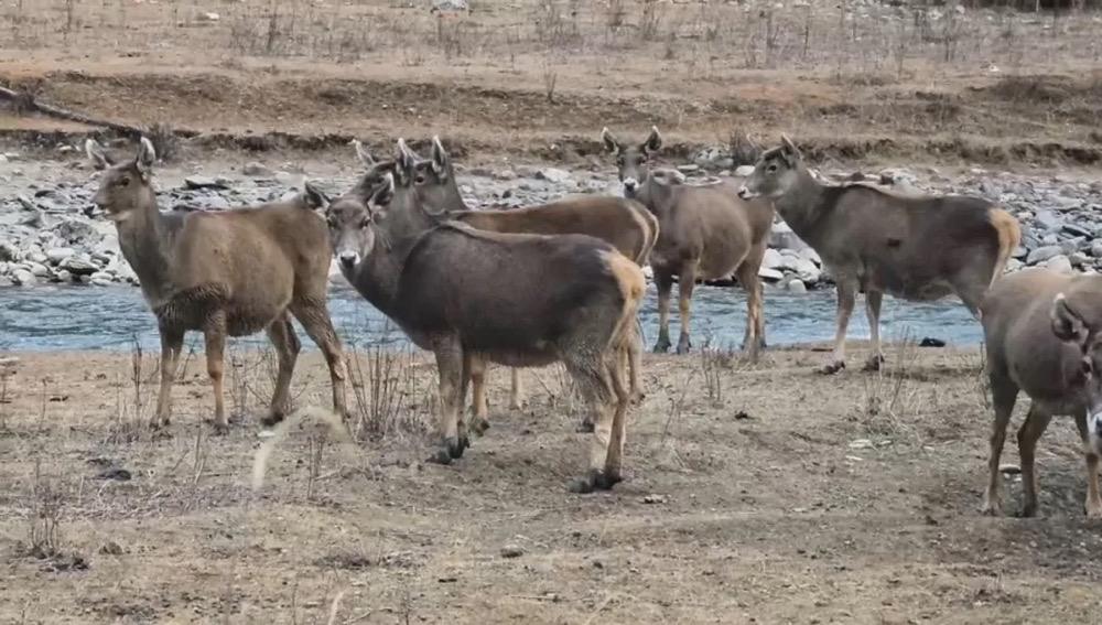 近日,白玉县麻绒乡察青松多国家级自然保护区内,上百只白唇鹿现身河边,吸引众多游客打卡拍照。